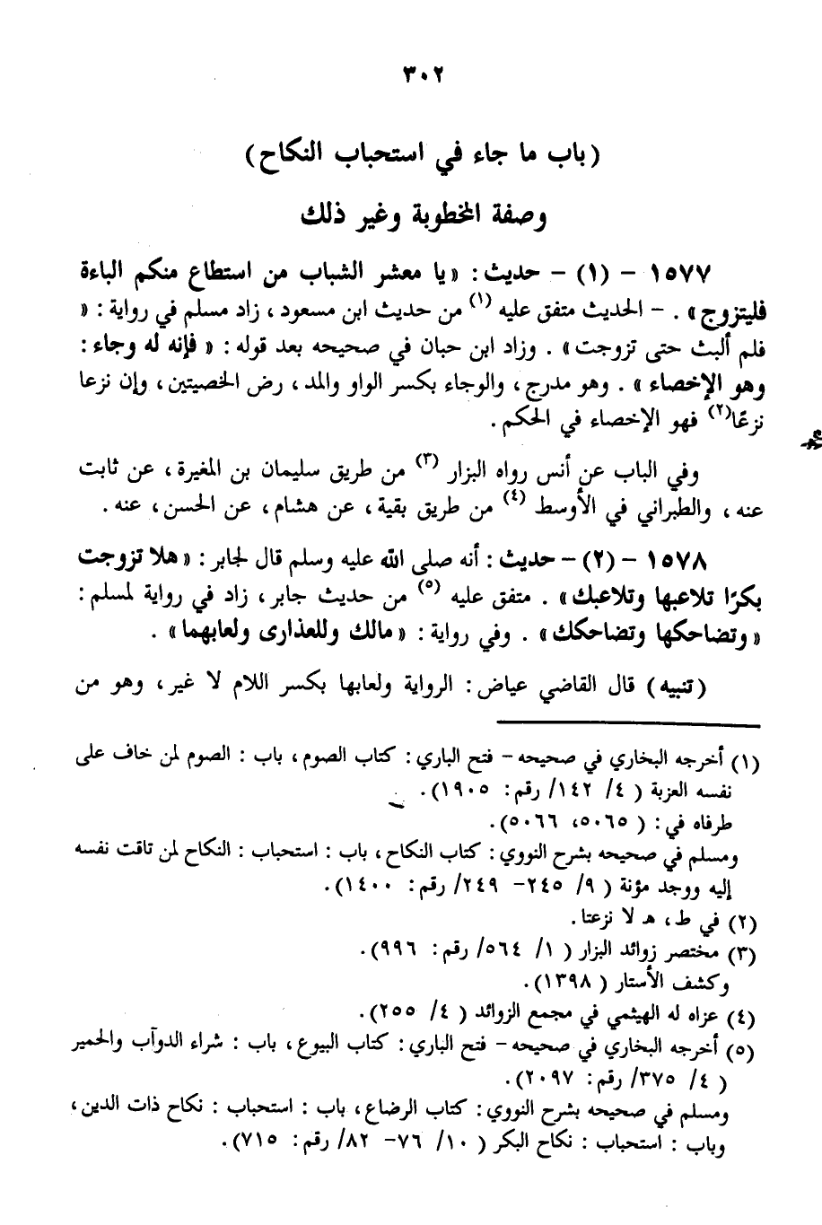 وَصِفَةُ الْمَخْطُوبَةِ وَغَيْرِ ذَلِكَ 50 1577 - (1) - حَدِيثٌ: «يَا مَعْشَرَ الشَّبَابِ مَنْ اسْتَطَاعَ مِنْكُمْ الْبَاءَةَ فَلْيَتَزَوَّجْ» . - الْحَدِيثُ مُتَّفَقٌ عَلَيْهِ مِنْ حَدِيثِ ابْنِ مَسْعُودٍ، زَادَ مُسْلِمٌ فِي رِوَايَةٍ: " فَلَمْ أَلْبَثْ حَتَّى تَزَوَّجْت ".