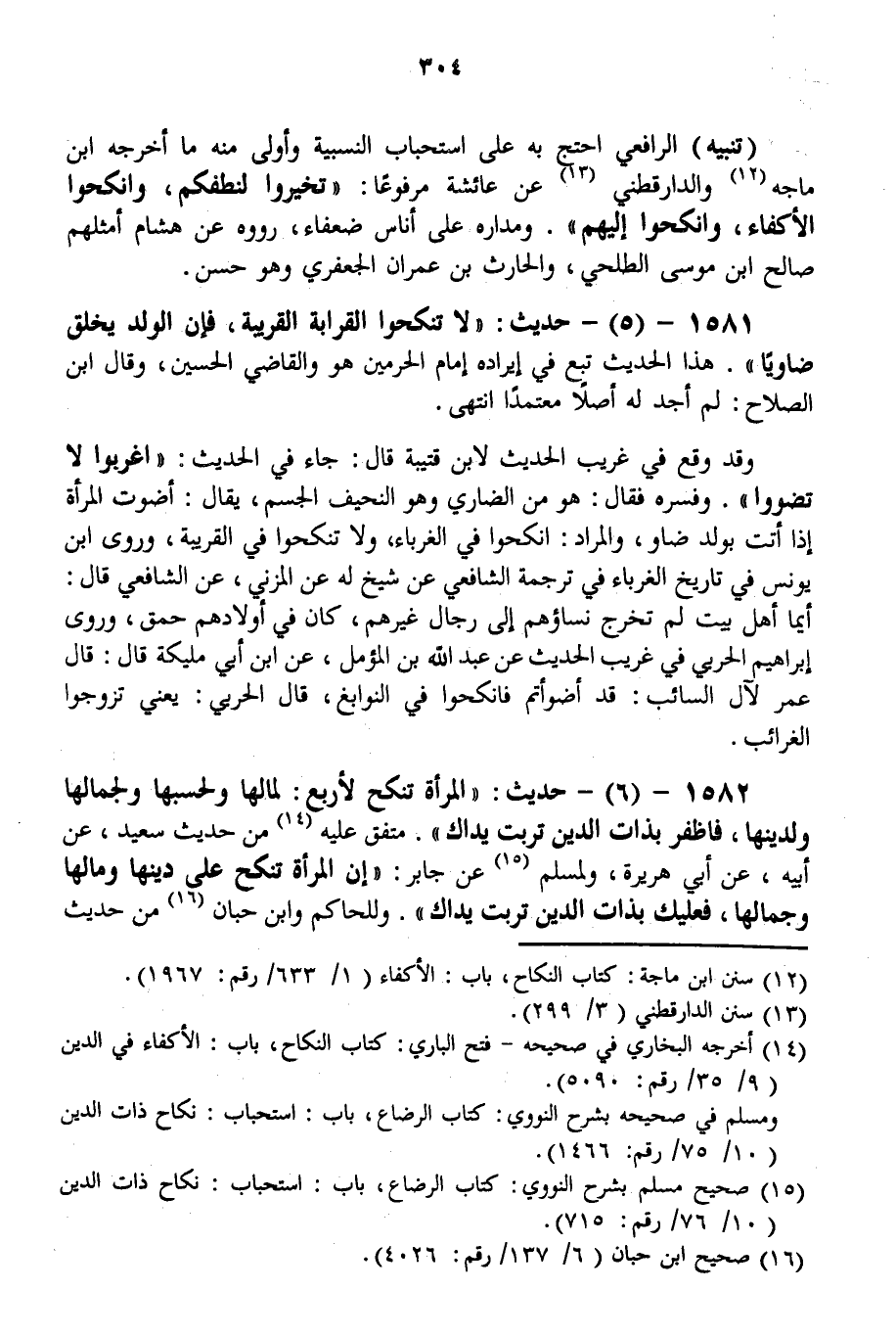 الرَّافِعِيُّ احْتَجَّ بِهِ عَلَى اسْتِحْبَابِ النِّسْبِيَّةِ وَأَوْلَى مِنْهُ مَا أَخْرَجَهُ ابْنُ مَاجَهْ وَالدَّارَقُطْنِيّ (عَنْ عَائِشَةَ مَرْفُوعًا: «تَخَيَّرُوا لِنُطَفِكُمْ، وَانْكِحُوا الْأَكْفَاءَ، وَانْكِحُوا إلَيْهِمْ» . ومَدَارُهُ عَلَى أُنَاسٍ ضُعَفَاءَ، رَوَوْهُ عَنْ هِشَامٍ أَمْثَلُهُمْ صَالِحُ بْنُ مُوسَى الطَّلْحِيُّ، وَالْحَارِثُ بْنُ عِمْرَانَ الْجَعْفَرِيُّ وَهُوَ حَسَنٌ.