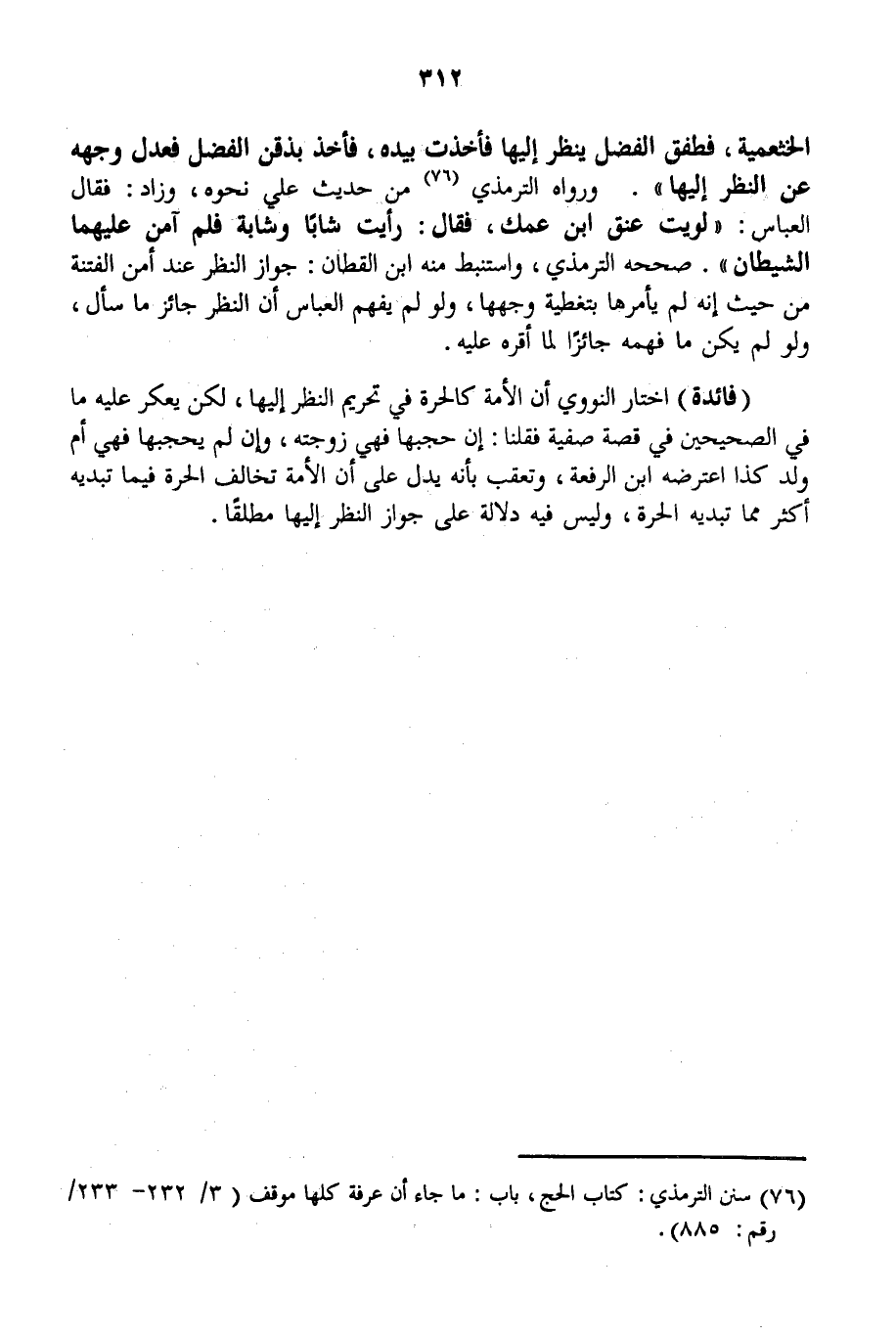 الْخَثْعَمِيَّةِ، فَطَفِقَ الْفَضْلُ يَنْظُرُ إلَيْهَا فَأَخَذْتُ بِيَدِهِ، فَأَخَذَ بِذَقَنِ الْفَضْلِ فَعَدَلَ وَجْهَهُ عَنْ النَّظَرِ إلَيْهَا» وَرَوَاهُ التِّرْمِذِيُّ مِنْ حَدِيثِ عَلِيٍّ نَحْوَهُ، وَزَادَ: «فَقَالَ الْعَبَّاسُ: لَوَيْت عُنُقَ ابْنِ عَمِّك، فَقَالَ: رَأَيْت شَابًّا وَشَابَّةً فَلَمْ آمَنْ عَلَيْهِمَا الشَّيْطَانَ» . صَحَّحَهُ التِّرْمِذِيُّ، وَاسْتَنْبَطَ مِنْهُ ابْنُ الْقَطَّانِ: جَوَازَ النَّظَرِ عِنْدَ أَمْنِ الْفِتْنَةِ مِنْ حَيْثُ إنَّهُ لَمْ يَأْمُرْهَا بِتَغْطِيَةِ وَجْهِهَا، وَلَوْ لَمْ يَفْهَمْ الْعَبَّاسُ أَنَّ النَّظَرَ جَائِزٌ مَا سَأَلَ، وَلَوْ لَمْ يَكُنْ مَا فَهِمَهُ جَائِزًا لَمَا أَقَرَّهُ عَلَيْهِ.