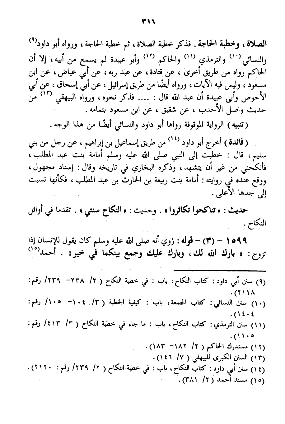 الصَّلَاةِ، وَخُطْبَةَ الْحَاجَةِ. فَذَكَرَ خُطْبَةَ الصَّلَاةِ، ثُمَّ خُطْبَةَ الْحَاجَةِ» ، وَرَوَاهُ أَبُو دَاوُد وَالنَّسَائِيُّ وَالتِّرْمِذِيُّ وَالْحَاكِمُ وَأَبُو عُبَيْدَةَ لَمْ يَسْمَعْ مِنْ أَبِيهِ، إلَّا أَنَّ الْحَاكِمَ رَوَاهُ مِنْ طَرِيقٍ أُخْرَى، عَنْ قَتَادَةَ، عَنْ عَبْدِ رَبِّهِ، عَنْ أَبِي عِيَاضٍ، عَنْ ابْنِ مَسْعُودٍ، وَلَيْسَ فِيهِ الْآيَاتُ، وَرَوَاهُ أَيْضًا مِنْ طَرِيقِ إسْرَائِيلَ، عَنْ أَبِي إِسْحَاقَ، عَنْ أَبِي الْأَحْوَصِ وَأَبِي عُبَيْدَةَ أَنَّ عَبْدَ اللَّهِ قَالَ: فَذَكَرَ نَحْوَهُ، وَرَوَاهُ الْبَيْهَقِيّ مِنْ حَدِيثِ وَاصِلٍ الْأَحْدَبِ، عَنْ شَقِيقٍ، عَنْ ابْنِ مَسْعُودٍ بِتَمَامِهِ.