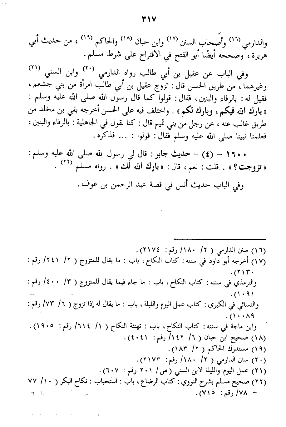 1600 - (4) - حَدِيثُ جَابِرٍ: «قَالَ لِي رَسُولُ اللَّهِ - صَلَّى اللَّهُ عَلَيْهِ وَسَلَّمَ - تَزَوَّجْت؟ . قُلْت: نَعَمْ، قَالَ: بَارَكَ اللَّهُ لَك» . رَوَاهُ مُسْلِمٌ. وَفِي الْبَابِ حَدِيثُ أَنَسٍ فِي قِصَّةِ عَبْدِ الرَّحْمَنِ بْنِ عَوْفٍ.