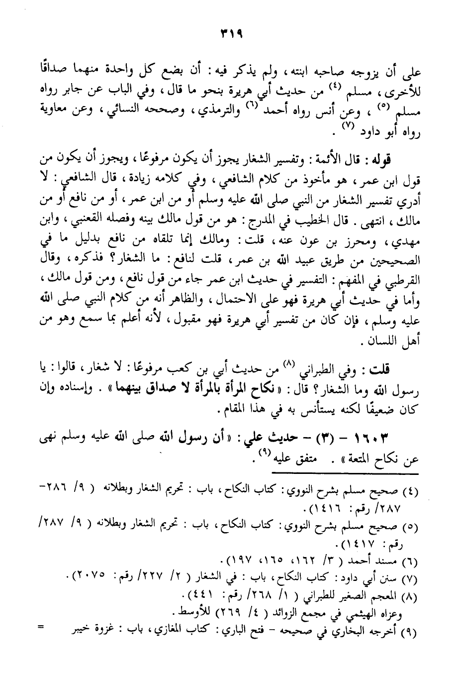 عَلَى أَنْ يُزَوِّجَهُ صَاحِبُهُ ابْنَتَهُ» ، وَلَمْ يَذْكُرْ فِيهِ: أَنَّ بُضْعَ كُلِّ وَاحِدَةٍ مِنْهُمَا صَدَاقًا لِلْأُخْرَى، مُسْلِمٌ مِنْ حَدِيثِ أَبِي هُرَيْرَةَ بِنَحْوِ مَا قَالَ، وَفِي الْبَابِ عَنْ جَابِرٍ رَوَاهُ مُسْلِمٌ، وَعَنْ أَنَسٍ رَوَاهُ أَحْمَدُ وَالتِّرْمِذِيُّ، وَصَحَّحَهُ النَّسَائِيُّ، وَعَنْ مُعَاوِيَةَ رَوَاهُ أَبُو دَاوُد.