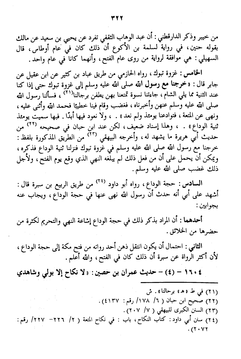 الْخَامِسُ: غَزْوَةُ تَبُوكِ، رَوَاهُ الْحَازِمِيُّ مِنْ طَرِيقِ عَبَّادِ بْنِ كَثِيرٍ عَنْ ابْنِ عَقِيلٍ عَنْ جَابِرٍ قَالَ: «خَرَجْنَا مَعَ رَسُولِ اللَّهِ - صَلَّى اللَّهُ عَلَيْهِ وَسَلَّمَ - إلَى غَزْوَةِ تَبُوكَ حَتَّى إذَا كُنَّا عِنْدَ الثَّنِيَّةِ مِمَّا يَلِي الشَّامَ، جَاءَتْنَا نِسْوَةٌ تَمَتَّعْنَا بِهِنَّ يَطُفْنَ بِرِجَالِنَا، فَسَأَلْنَا رَسُولَ اللَّهِ - صَلَّى اللَّهُ عَلَيْهِ وَسَلَّمَ - عَنْهُنَّ وَأَخْبَرْنَاهُ، فَغَضِبَ وَقَامَ فِينَا خَطِيبًا فَحَمِدَ اللَّهَ وَأَثْنَى عَلَيْهِ، وَنَهَى عَنْ الْمُتْعَةِ، فَتَوَادَعْنَا يَوْمَئِذٍ وَلَمْ نَعُدْ.، وَلَا نَعُودُ فِيهَا أَبَدًا. فَبِهَا سُمِّيَتْ يَوْمَئِذٍ ثَنِيَّةُ الْوَدَاعِ» ، وَهَذَا إسْنَادٌ ضَعِيفٌ، لَكِنْ عِنْدَ ابْنِ حِبَّانَ فِي صَحِيحِهِ مِنْ حَدِيثِ أَبِي هُرَيْرَةَ مَا يَشْهَدُ لَهُ.
