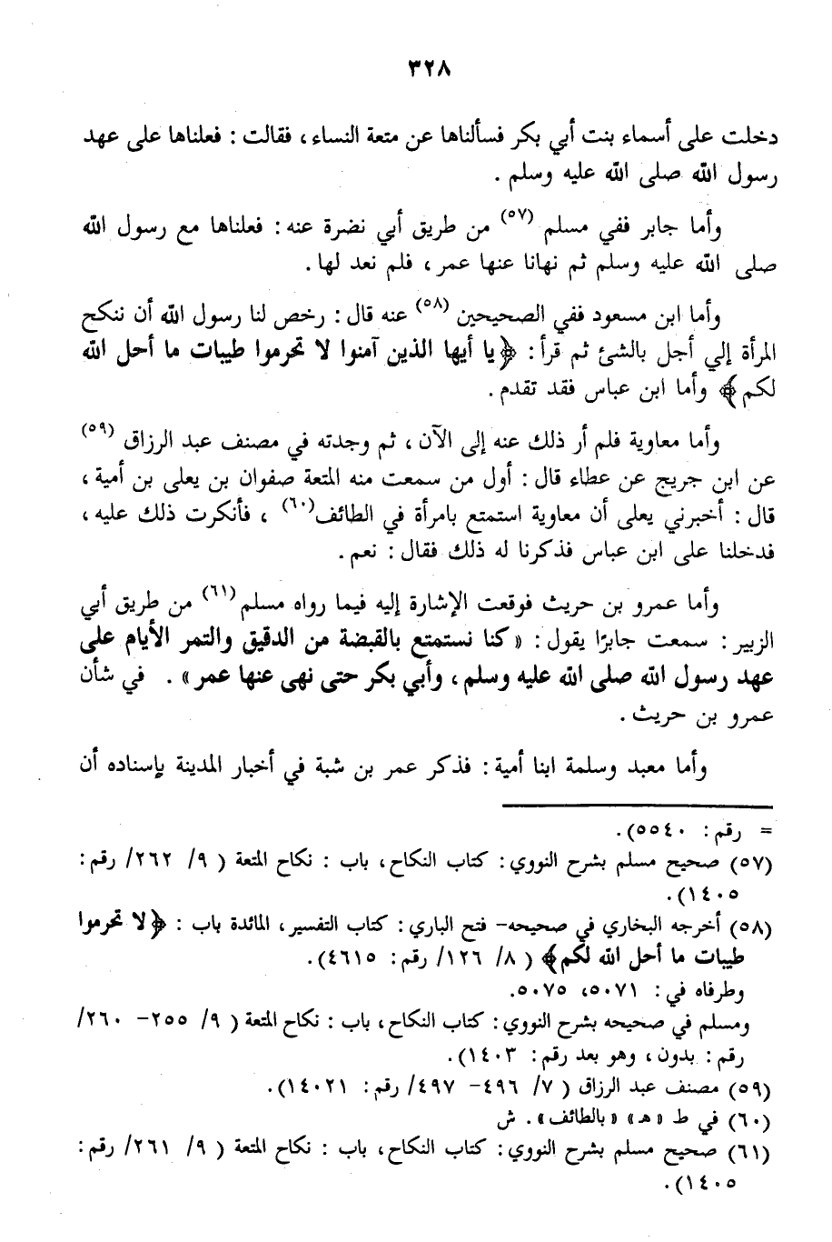 «دَخَلْت عَلَى أَسْمَاءَ بِنْتِ أَبِي بَكْرٍ فَسَأَلْنَاهَا عَنْ مُتْعَةِ النِّسَاءِ، فَقَالَتْ: فَعَلْنَاهَا عَلَى عَهْدِ رَسُولِ اللَّهِ - صَلَّى اللَّهُ عَلَيْهِ وَسَلَّمَ -» .