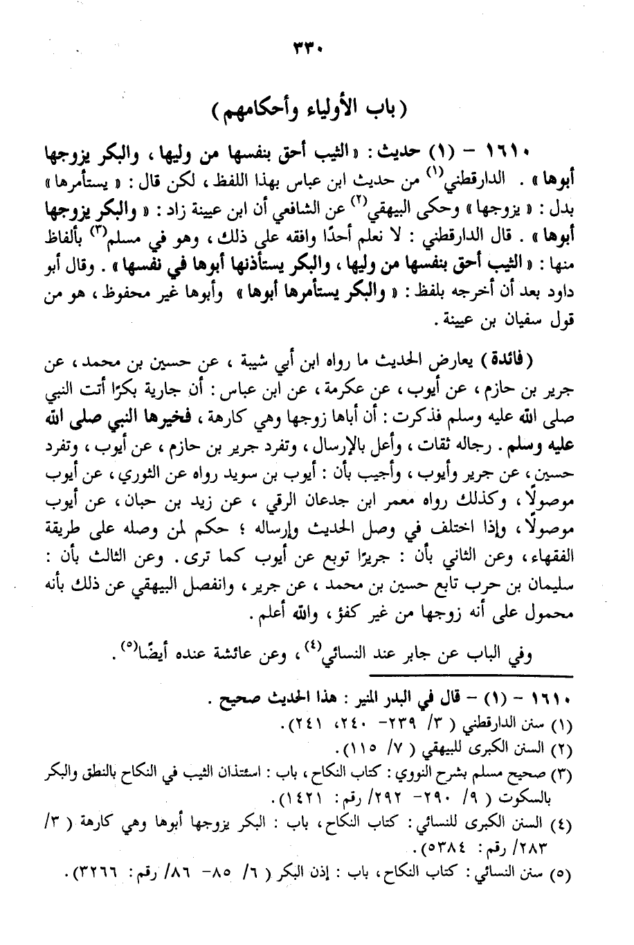 1610 - (1) حَدِيثُ: «الثَّيِّبُ أَحَقُّ بِنَفْسِهَا مِنْ وَلِيِّهَا، وَالْبِكْرُ يُزَوِّجُهَا أَبُوهَا» . الدَّارَقُطْنِيُّ مِنْ حَدِيثِ ابْنِ عَبَّاسٍ بِهَذَا اللَّفْظِ، لَكِنْ قَالَ: «يَسْتَأْمِرُهَا» بَدَلَ: «يُزَوِّجُهَا» وَحَكَى الْبَيْهَقِيّ عَنْ الشَّافِعِيِّ أَنَّ ابْنَ عُيَيْنَةَ زَادَ: «وَالْبِكْرُ يُزَوِّجُهَا أَبُوهَا» . قَالَ الدَّارَقُطْنِيُّ: لَا نَعْلَمُ أَحَدًا وَافَقَهُ عَلَى ذَلِكَ، وَهُوَ فِي مُسْلِمٍ بِأَلْفَاظٍ مِنْهَا: «الثَّيِّبُ أَحَقُّ بِنَفْسِهَا مِنْ وَلِيِّهَا، وَالْبِكْرُ يَسْتَأْذِنُهَا أَبُوهَا فِي نَفْسِهَا» . وَقَالَ أَبُو دَاوُد بَعْدَ أَنْ أَخْرَجَهُ بِلَفْظِ: «وَالْبِكْرُ يَسْتَأْمِرُهَا أَبُوهَا» وَأَبُوهَا غَيْرُ مَحْفُوظٍ، هُوَ مِنْ قَوْلِ سُفْيَانَ بْنِ عُيَيْنَةَ.