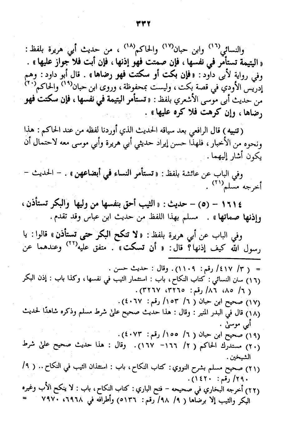 1614 - (5) - حَدِيثٌ: «الثَّيِّبُ أَحَقُّ بِنَفْسِهَا مِنْ وَلِيِّهَا وَالْبِكْرُ تُسْتَأْذَنُ، وَإِذْنُهَا صُمَاتُهَا» . مُسْلِمٌ بِهَذَا اللَّفْظِ مِنْ حَدِيثِ ابْنِ عَبَّاسٍ وَقَدْ تَقَدَّمَ. وَفِي الْبَابِ عَنْ أَبِي هُرَيْرَةَ بِلَفْظِ: «لَا تُنْكَحُ الْبِكْرُ حَتَّى تُسْتَأْذَنَ قَالُوا: يَا رَسُولَ اللَّهِ كَيْفَ إذْنُهَا؟ قَالَ: أَنْ تَسْكُتَ» . مُتَّفَقٌ عَلَيْهِ وَعِنْدَهُمَا عَنْ