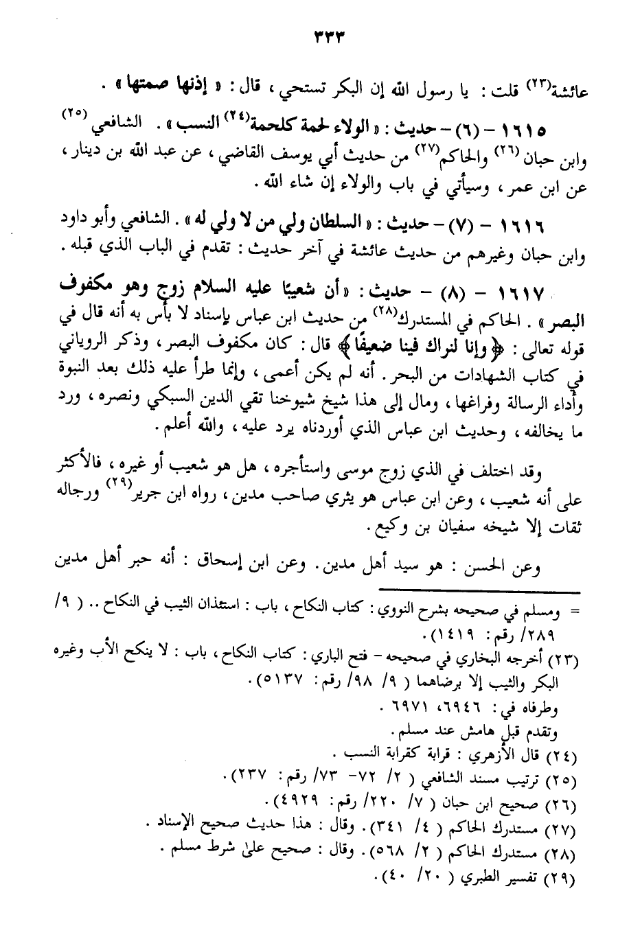 1617 - (8) - حَدِيثٌ: «أَنَّ شُعَيْبًا - عَلَيْهِ السَّلَامُ - زُوِّجَ وَهُوَ مَكْفُوفُ الْبَصَرِ» . الْحَاكِمُ فِي الْمُسْتَدْرَكِ مِنْ حَدِيثِ ابْنِ عَبَّاسٍ بِإِسْنَادٍ لَا بَأْسَ بِهِ أَنَّهُ قَالَ فِي قَوْله تَعَالَى: {وَإِنَّا لَنَرَاكَ فِينَا ضَعِيفًا} [هود: 91] قَالَ: كَانَ مَكْفُوفَ الْبَصَرِ، وَذَكَرَ الرُّويَانِيُّ فِي كِتَابِ الشَّهَادَاتِ مِنْ الْبَحْرِ. إنَّهُ لَمْ يَكُنْ أَعْمَى، وَإِنَّمَا طَرَأَ عَلَيْهِ ذَلِكَ بَعْدَ النُّبُوَّةِ وَأَدَاءِ الرِّسَالَةِ وَفَرَاغِهَا، وَمَالَ إلَى هَذَا شَيْخُ شُيُوخِنَا تَقِيُّ الدِّينِ السُّبْكِيُّ وَنَصَرَهُ، وَرَدَّ مَا يُخَالِفُهُ، وَحَدِيثُ ابْنِ عَبَّاسٍ الَّذِي أَوْرَدْنَاهُ يَرُدُّ عَلَيْهِ، وَاَللَّهُ أَعْلَمُ.