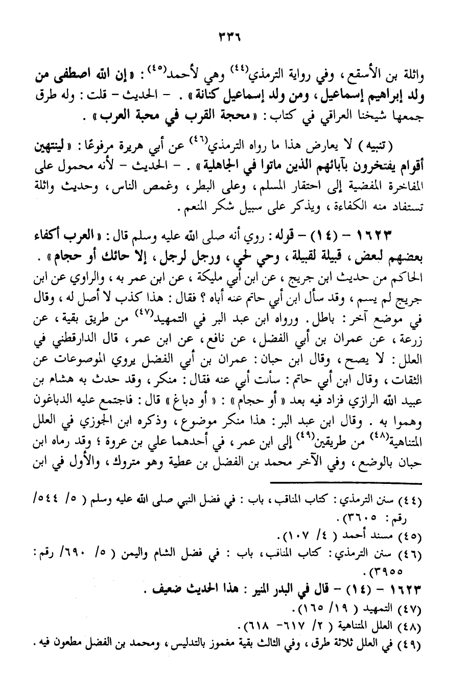 1623 - (14) - قَوْلُهُ: رُوِيَ أَنَّهُ - صَلَّى اللَّهُ عَلَيْهِ وَسَلَّمَ - قَالَ: «الْعَرَبُ أَكْفَاءٌ بَعْضُهُمْ لِبَعْضٍ، قَبِيلَةٌ لِقَبِيلَةٍ، وَحَيٌّ لِحَيٍّ، وَرَجُلٌ لِرَجُلٍ، إلَّا حَائِكٌ أَوْ حَجَّامٌ» . الْحَاكِمُ مِنْ حَدِيثِ ابْنِ جُرَيْجٍ، عَنْ ابْنِ أَبِي مُلَيْكَةَ، عَنْ ابْنِ عُمَرَ بِهِ، وَالرَّاوِي عَنْ ابْنِ جُرَيْجٍ لَمْ يُسَمَّ، وَقَدْ سَأَلَ ابْنُ أَبِي حَاتِمِ عَنْهُ أَبَاهُ؟ فَقَالَ: هَذَا كَذِبٌ لَا أَصْلَ لَهُ، وَقَالَ فِي مَوْضِعٍ آخَرَ: بَاطِلٌ. وَرَوَاهُ ابْنُ عَبْدِ الْبَرِّ فِي التَّمْهِيدِ مِنْ طَرِيقِ بَقِيَّةَ، عَنْ زُرْعَةَ، عَنْ عِمْرَانَ بْنِ أَبِي الْفَضْلِ، عَنْ نَافِعٍ، عَنْ ابْنِ عُمَرَ، قَالَ الدَّارَقُطْنِيُّ فِي الْعِلَلِ: لَا يَصِحُّ، وَقَالَ ابْنُ حِبَّانَ: عِمْرَانُ بْنُ أَبِي الْفَضْلِ يَرْوِي الْمَوْضُوعَاتِ عَنْ الثِّقَاتِ، وَقَالَ ابْنُ أَبِي حَاتِمٍ: سَأَلْت أَبِي عَنْهُ فَقَالَ: مُنْكَرٌ، وَقَدْ حَدَّثَ بِهِ هِشَامُ بْنُ عُبَيْدِ اللَّهِ الرَّازِيّ فَزَادَ فِيهِ بَعْدَ «أَوْ حَجَّامٌ» : «أَوْ دَبَّاغٌ» قَالَ: فَاجْتَمَعَ عَلَيْهِ الدَّبَّاغُونَ وَهَمُّوا بِهِ.