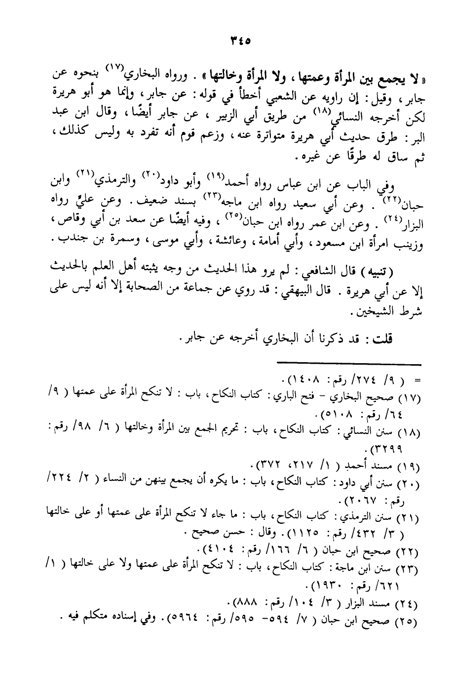 «لَا يُجْمَعُ بَيْنَ الْمَرْأَةِ وَعَمَّتِهَا، وَلَا الْمَرْأَةِ وَخَالَتِهَا» . وَرَوَاهُ الْبُخَارِيُّ بِنَحْوِهِ عَنْ جَابِرٍ، وَقِيلَ: إنَّ رَاوِيَهُ عَنْ الشَّعْبِيِّ أَخْطَأَ فِي قَوْلِهِ: عَنْ جَابِرٍ، وَإِنَّمَا هُوَ أَبُو هُرَيْرَةَ لَكِنْ أَخْرَجَهُ النَّسَائِيُّ مِنْ طَرِيقِ أَبِي الزُّبَيْرِ، عَنْ جَابِرٍ أَيْضًا، وَقَالَ ابْنُ عَبْدِ الْبَرِّ: طُرُقُ حَدِيثِ أَبِي هُرَيْرَةَ مُتَوَاتِرَةٌ عَنْهُ، وَزَعَمَ قَوْمٌ أَنَّهُ تَفَرَّدَ بِهِ وَلَيْسَ كَذَلِكَ، ثُمَّ سَاقَ لَهُ طُرُقًا عَنْ غَيْرِهِ.