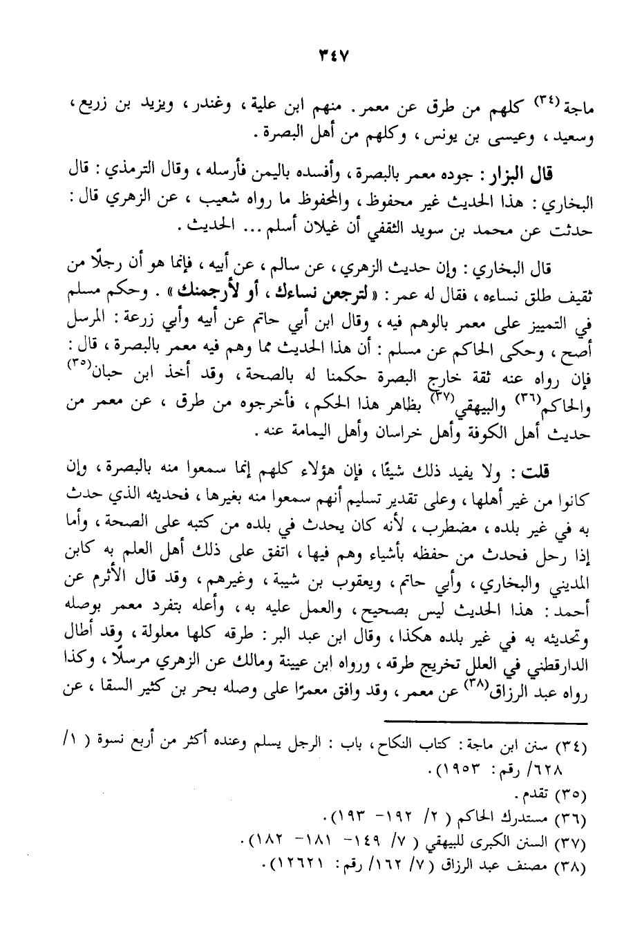 قَالَ الْبُخَارِيُّ: وَإِنَّ حَدِيثَ الزُّهْرِيِّ، عَنْ سَالِمٍ، عَنْ أَبِيهِ، فَإِنَّمَا هُوَ أَنَّ رَجُلًا مِنْ ثَقِيفٍ طَلَّقَ نِسَاءَهُ، فَقَالَ لَهُ عُمَرُ: " لِتُرْجِعَن نِسَاءَك، أَوْ لَأَرْجُمَنك ". وَحَكَمَ مُسْلِمٌ فِي التَّمَيُّزِ عَلَى مَعْمَرٍ بِالْوَهْمِ فِيهِ، وَقَالَ ابْنُ أَبِي حَاتِمٍ عَنْ أَبِيهِ وَأَبِي زُرْعَةَ: الْمُرْسَلُ أَصَحُّ، وَحَكَى الْحَاكِمُ عَنْ مُسْلِمٍ: أَنَّ هَذَا الْحَدِيثَ مِمَّا وَهَمَ فِيهِ مَعْمَرٌ بِالْبَصْرَةِ، قَالَ: فَإِنْ رَوَاهُ عَنْهُ ثِقَةٌ خَارِجَ الْبَصْرَةِ حَكَمْنَا لَهُ بِالصِّحَّةِ.