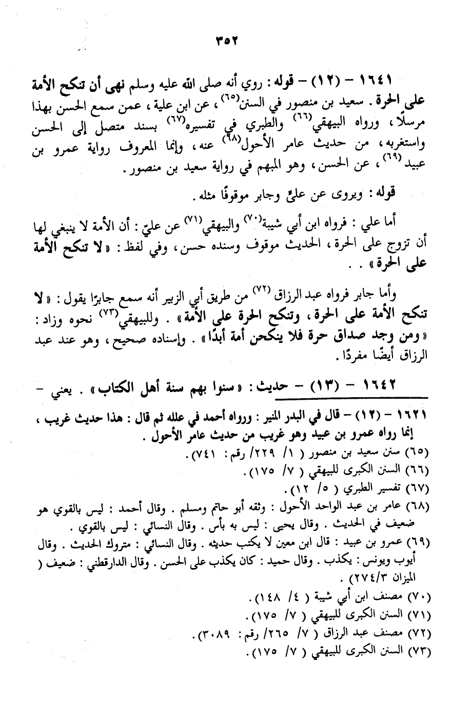 قَوْلُهُ: رُوِيَ أَنَّهُ - صَلَّى اللَّهُ عَلَيْهِ وَسَلَّمَ - «نَهَى أَنْ تُنْكَحَ الْأَمَةُ عَلَى الْحُرَّةِ» . سَعِيدُ بْنُ مَنْصُورٍ فِي السُّنَنِ، عَنْ ابْنِ عُلَيَّةَ، عَمَّنْ سَمِعَ الْحَسَنَ بِهَذَا مُرْسَلًا، وَرَوَاهُ الْبَيْهَقِيُّ وَالطَّبَرِيُّ فِي تَفْسِيرِهِ بِسَنَدٍ مُتَّصِلٍ إلَى الْحَسَنِ وَاسْتَغْرَبَهُ، مِنْ حَدِيثِ عَامِرٍ الْأَحْوَلِ عَنْهُ، وَإِنَّمَا الْمَعْرُوفُ رِوَايَةُ عَمْرِو بْنِ عُبَيْدٍ، عَنْ الْحَسَنِ، وَهُوَ الْمُبْهَمُ فِي رِوَايَةِ سَعِيدِ بْنِ مَنْصُورٍ.