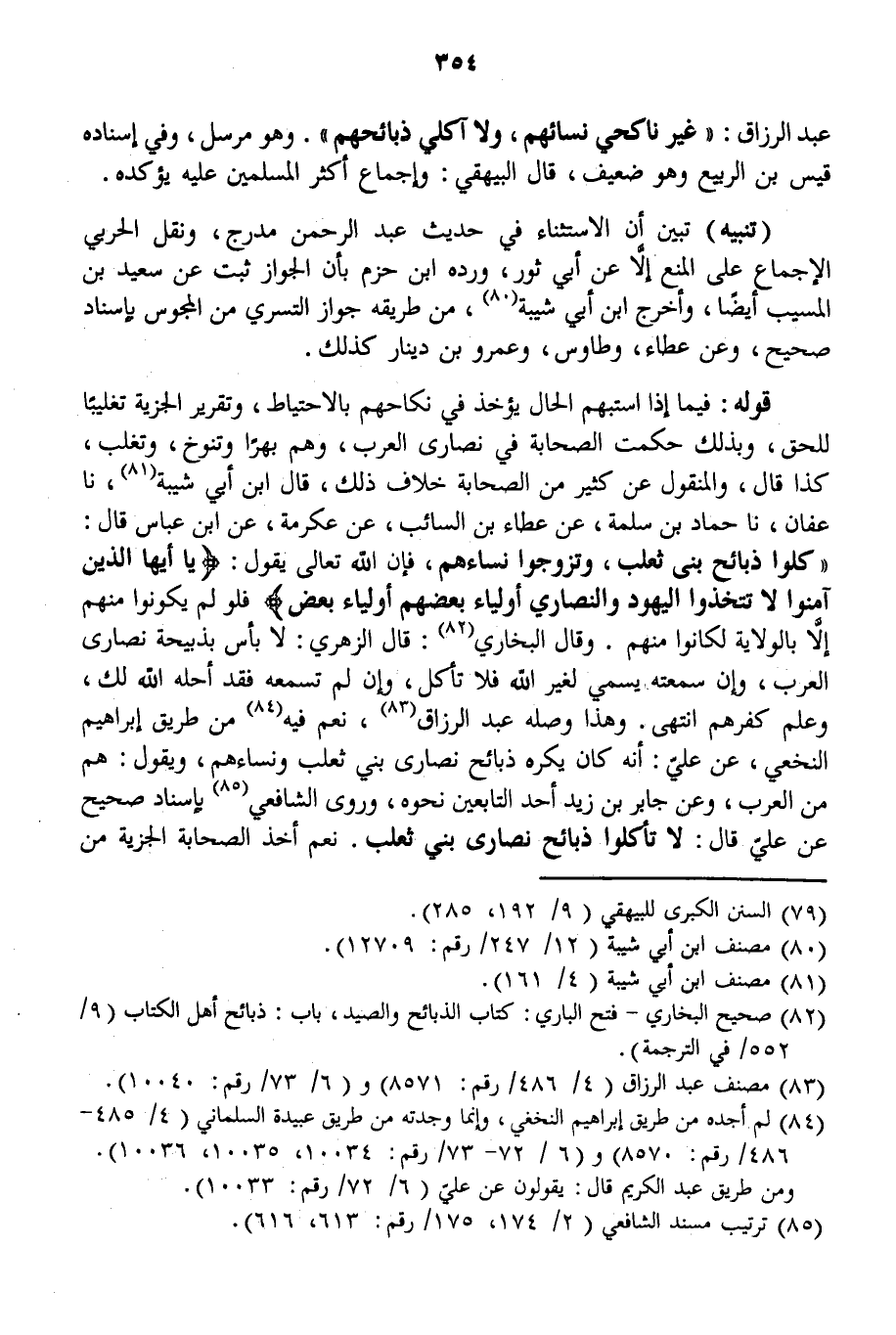 عَبْدِ الرَّزَّاقِ: «غَيْرُ نَاكِحِي نِسَائِهِمْ، وَلَا آكِلِي ذَبَائِحِهِمْ» . وَهُوَ مُرْسَلٌ، وَفِي إسْنَادِهِ قَيْسُ بْنُ الرَّبِيعِ وَهُوَ ضَعِيفٌ، قَالَ الْبَيْهَقِيُّ: وَإِجْمَاعُ أَكْثَرِ الْمُسْلِمِينَ عَلَيْهِ يُؤَكِّدهُ.