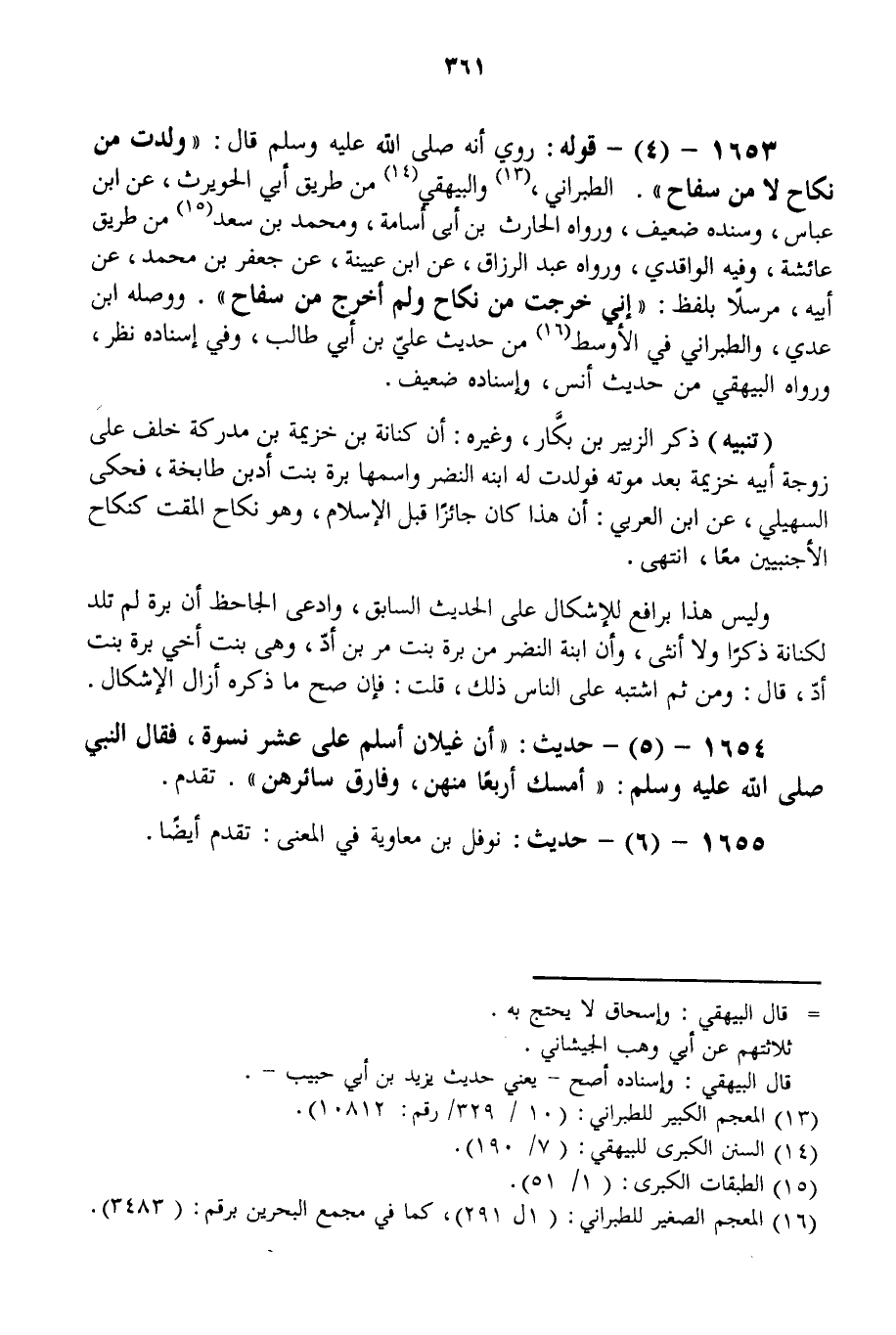 1653 - (4) - قَوْلُهُ: رُوِيَ أَنَّهُ - صَلَّى اللَّهُ عَلَيْهِ وَسَلَّمَ - قَالَ: «وُلِدْت مِنْ نِكَاحٍ لَا مِنْ سِفَاحٍ» . الطَّبَرَانِيُّ، وَالْبَيْهَقِيُّ مِنْ طَرِيقِ أَبِي الْحُوَيْرِثِ، عَنْ ابْنِ عَبَّاسٍ، وَسَنَدُهُ ضَعِيفٌ، وَرَوَاهُ الْحَارِثُ بْنُ أَبِي أُسَامَةَ، وَمُحَمَّدُ بْنُ سَعْدٍ مِنْ طَرِيقِ عَائِشَةَ، وَفِيهِ الْوَاقِدِيُّ، وَرَوَاهُ عَبْدُ الرَّزَّاقِ، عَنْ ابْنِ عُيَيْنَةَ، عَنْ جَعْفَرِ بْنِ مُحَمَّدٍ، عَنْ أَبِيهِ، مُرْسَلًا بِلَفْظِ: «إنِّي خَرَجْت مِنْ نِكَاحٍ وَلَمْ أَخْرُجْ مِنْ سِفَاحٍ» . وَوَصَلَهُ ابْنُ عَدِيٍّ، وَالطَّبَرَانِيُّ فِي الْأَوْسَطِ مِنْ حَدِيثِ عَلِيِّ بْنِ أَبِي طَالِبٍ، وَفِي إسْنَادِهِ نَظَرٌ، وَرَوَاهُ الْبَيْهَقِيّ مِنْ حَدِيثِ أَنَسٍ، وَإِسْنَادِهِ ضَعِيفٌ.