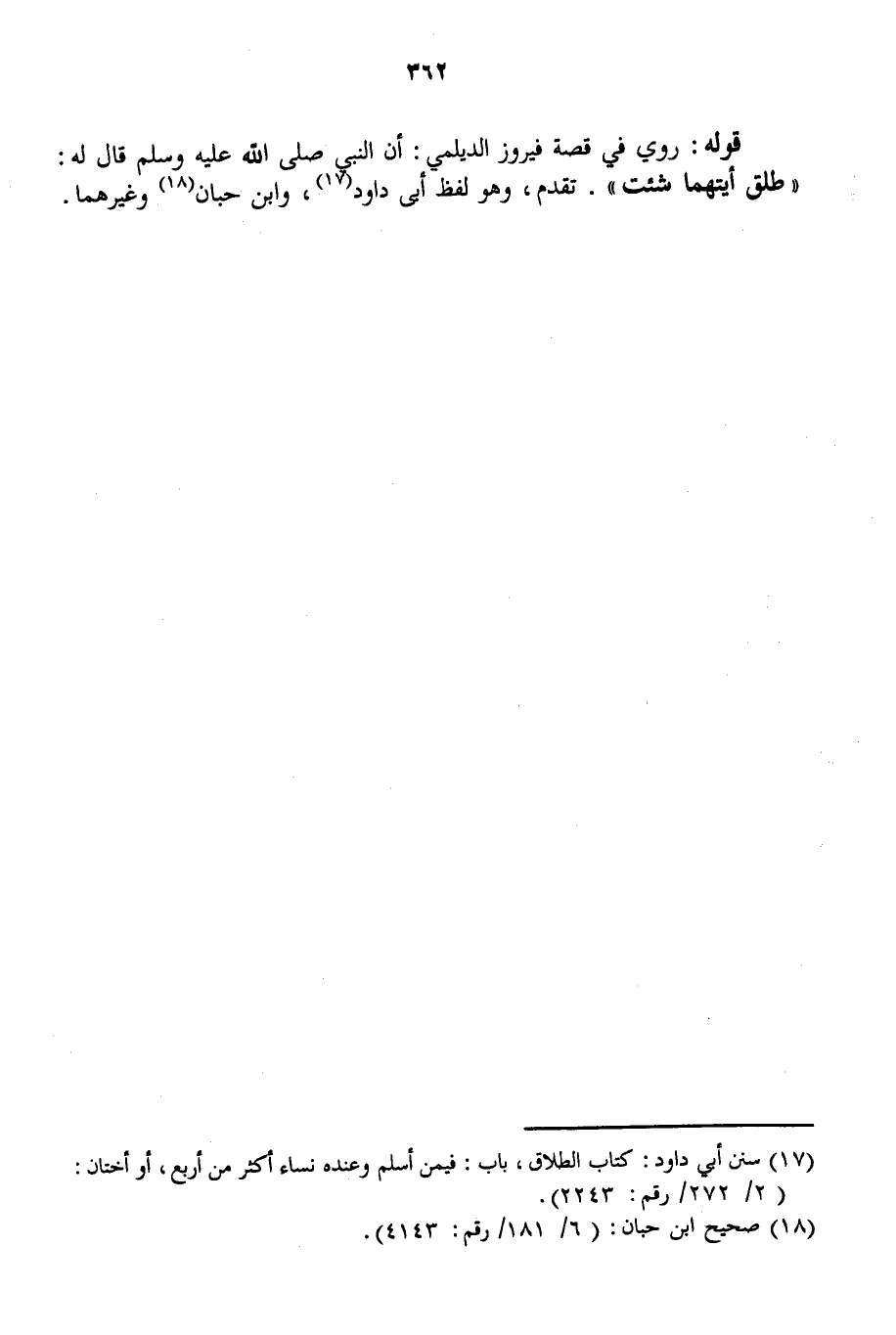 قَوْلُهُ: رُوِيَ فِي قِصَّةِ «فَيْرُوزَ الدَّيْلَمِيِّ: أَنَّ النَّبِيَّ - صَلَّى اللَّهُ عَلَيْهِ وَسَلَّمَ - قَالَ لَهُ: طَلِّقْ أَيَّتَهمَا شِئْت» . تَقَدَّمَ، وَهُوَ لَفْظُ أَبِي دَاوُد، وَابْنِ حِبَّانَ وَغَيْرِهِمَا.