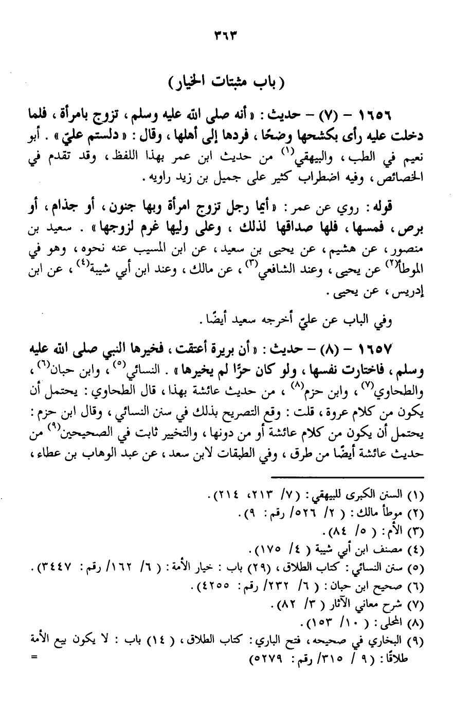 1657 - (8) - حَدِيثٌ: «أَنَّ بَرِيرَةَ أُعْتِقَتْ، فَخَيَّرَهَا النَّبِيُّ - صَلَّى اللَّهُ عَلَيْهِ وَسَلَّمَ -، فَاخْتَارَتْ نَفْسَهَا، وَلَوْ كَانَ حُرًّا لَمْ يُخَيِّرْهَا» . النَّسَائِيُّ، وَابْنُ حِبَّانَ، وَالطَّحَاوِيُّ، وَابْنُ حَزْمٍ، مِنْ حَدِيثِ عَائِشَةَ بِهَذَا، قَالَ الطَّحَاوِيُّ: يُحْتَمَلُ أَنْ يَكُونَ مِنْ كَلَامِ عُرْوَةَ، قُلْت: وَقَعَ التَّصْرِيحُ بِذَلِكَ فِي سُنَنِ النَّسَائِيّ.