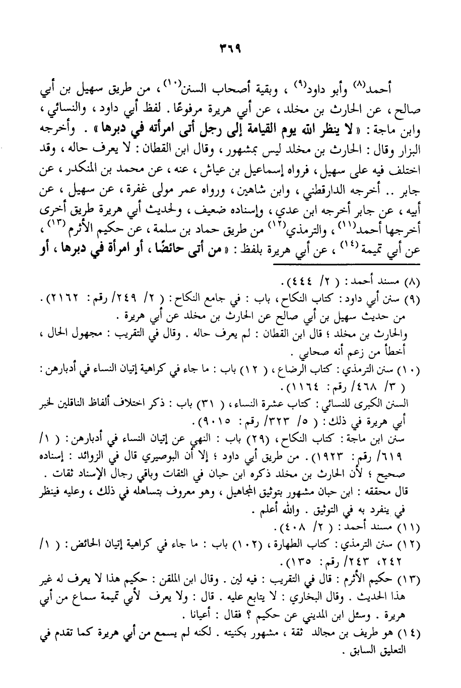 أَحْمَدُ وَأَبُو دَاوُد، وَبَقِيَّةُ أَصْحَابِ السُّنَنِ، مِنْ طَرِيقِ سُهَيْلِ بْنِ أَبِي صَالِحٍ، عَنْ الْحَارِثِ بْنِ مَخْلَدٍ، عَنْ أَبِي هُرَيْرَةَ مَرْفُوعًا. لَفْظُ أَبِي دَاوُد، وَالنَّسَائِيِّ، وَابْنِ مَاجَهْ: «لَا يَنْظُرُ اللَّهُ يَوْمَ الْقِيَامَةِ إلَى رَجُلٍ أَتَى امْرَأَتَهُ فِي دُبُرِهَا» . وَأَخْرَجَهُ الْبَزَّارُ.