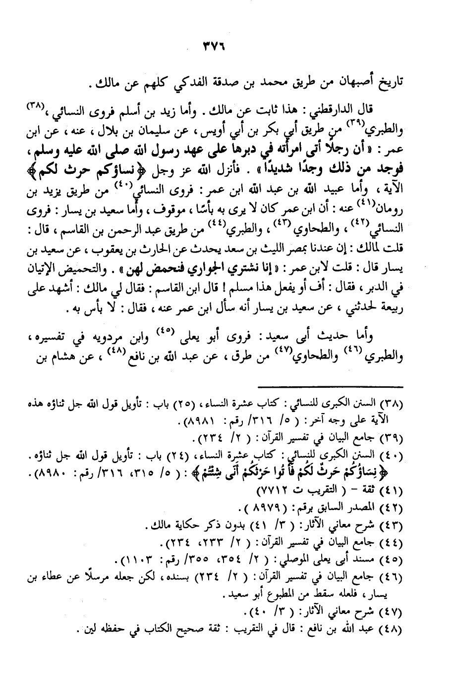 فَأَنْزَلَ اللَّهُ عَزَّ وَجَلَّ {نِسَاؤُكُمْ حَرْثٌ لَكُمْ} [البقرة: 223] الْآيَةَ، وَأَمَّا عُبَيْدُ اللَّهِ بْنُ عَبْدِ اللَّهِ بْنِ عُمَرَ: فَرَوَى النَّسَائِيُّ مِنْ طَرِيقِ يَزِيدَ بْنِ رُومَانَ عَنْهُ: أَنَّ ابْنَ عُمَرَ كَانَ لَا يَرَى بِهِ بَأْسًا، مَوْقُوفٌ، وَأَمَّا سَعِيدُ بْنُ يَسَارٍ: فَرَوَى النَّسَائِيُّ، وَالطَّحَاوِيُّ، وَالطَّبَرِيُّ مِنْ طَرِيقِ عَبْدِ الرَّحْمَنِ بْنِ الْقَاسِمِ، قَالَ: قُلْت لِمَالِكٍ: إنَّ عِنْدَنَا بِمِصْرٍ اللَّيْثَ بْنَ سَعْدٍ يُحَدِّثْ عَنْ الْحَارِثِ بْنِ يَعْقُوبَ، عَنْ سَعِيدِ بْنِ يَسَارٍ قَالَ: قُلْت لِابْنِ عُمَرَ: " إنَّا نَشْتَرِي الْجَوَارِيَ فَنُحَمِّضُ لَهُنَّ ". وَالتَّحْمِيضُ الْإِتْيَانُ فِي الدُّبُرِ، فَقَالَ: أُفٍّ أَوَ يَفْعَلُ هَذَا مُسْلِمٌ، قَالَ ابْنُ الْقَاسِمِ: فَقَالَ لِي مَالِكٌ: أَشْهَدُ عَلَى رَبِيعَةَ لَحَدَّثَنِي، عَنْ سَعِيدِ بْنِ يَسَارٍ أَنَّهُ سَأَلَ ابْنَ عُمَرَ عَنْهُ، فَقَالَ: لَا بَأْسَ بِهِ.