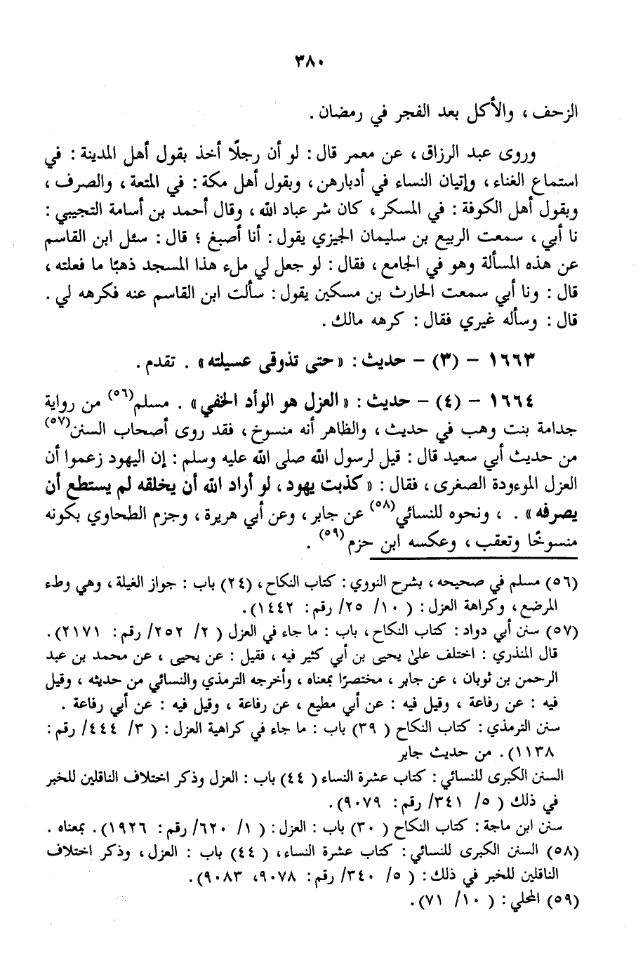1664 - (4) - حَدِيثٌ: «الْعَزْلُ هُوَ الْوَأْدُ الْخَفِيُّ» . مُسْلِمٌ مِنْ رِوَايَةِ جُدَامَةَ بِنْتِ وَهْبٍ فِي حَدِيثٍ، وَالظَّاهِرُ أَنَّهُ مَنْسُوخٌ، فَقَدْ رَوَى أَصْحَابُ السُّنَنِ مِنْ حَدِيثِ أَبِي سَعِيدٍ قَالَ: قِيلَ لِرَسُولِ اللَّهِ - صَلَّى اللَّهُ عَلَيْهِ وَسَلَّمَ -: «إنَّ الْيَهُودَ زَعَمُوا أَنَّ الْعَزْلَ الْمَوْءُودَةُ الصُّغْرَى، فَقَالَ: كَذَبَتْ يَهُودٌ، لَوْ أَرَادَ اللَّهُ أَنْ يَخْلُقَهُ لَمْ يَسْتَطِعْ أَنْ يَصْرِفَهُ» . وَنَحْوُهُ لِلنِّسَائِيِّ عَنْ جَابِرٍ، وَعَنْ أَبِي هُرَيْرَةَ، وَجَزَمَ الطَّحَاوِيُّ بِكَوْنِهِ مَنْسُوخًا وَتَعَقَّبْ، وَعَكْسَهُ ابْنُ حَزْمٍ.