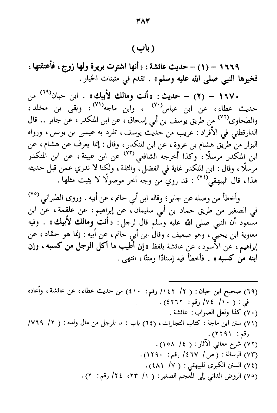 1670 - (2) - حَدِيثٌ: «أَنْتَ وَمَالُك لِأَبِيك» . ابْنُ حِبَّانَ مِنْ حَدِيثِ عَطَاءٍ، عَنْ ابْنِ عَبَّاسٍ، وَابْنِ مَاجَهْ، وَبَقِيِّ بْنِ مَخْلَدٍ، وَالطَّحَاوِيِّ مِنْ طَرِيقِ يُوسُفَ بْنِ أَبِي إِسْحَاقَ، عَنْ ابْنِ الْمُنْكَدِرِ، عَنْ جَابِرٍ. قَالَ الدَّارَقُطْنِيُّ فِي الْأَفْرَادِ: غَرِيبٌ مِنْ حَدِيثِ يُوسُفَ، تَفَرَّدَ بِهِ عِيسَى بْنُ يُونُسَ، وَرَوَاهُ الْبَزَّارُ مِنْ طَرِيقِ هِشَامِ بْنِ عُرْوَةَ، عَنْ ابْنِ الْمُنْكَدِرِ، وَقَالَ: إنَّمَا يُعْرَفُ عَنْ هِشَامٍ، عَنْ ابْنِ الْمُنْكَدِرِ مُرْسَلًا، وَكَذَا أَخْرَجَهُ الشَّافِعِيُّ عَنْ ابْنِ عُيَيْنَةَ، عَنْ ابْنِ الْمُنْكَدِرِ مُرْسَلًا، وَقَالَ: ابْنُ الْمُنْكَدِر غَايَةٌ فِي الْفَضْلِ وَالثِّقَةِ، وَلَكِنَّا لَا نَدْرِي عَمَّنْ قَبِلَ حَدِيثَهُ هَذَا، قَالَ الْبَيْهَقِيُّ: قَدْ رُوِيَ مِنْ وَجْهٍ آخَرَ مَوْصُولًا لَا يَثْبُتُ مِثْلُهَا. وَأَخْطَأَ مَنْ وَصَلَهُ عَنْ جَابِرٍ؛ وَقَالَهُ ابْنُ أَبِي حَاتِمٍ، عَنْ أَبِيهِ.