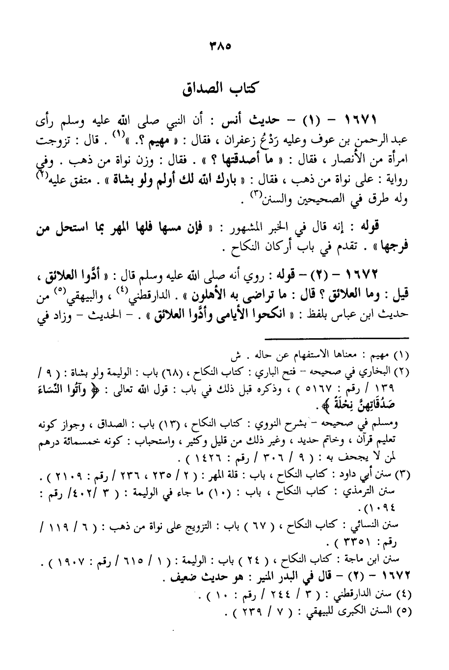 1671 - (1) - حَدِيثُ أَنَسٍ: «أَنَّ النَّبِيَّ - صَلَّى اللَّهُ عَلَيْهِ وَسَلَّمَ - رَأَى عَبْدَ الرَّحْمَنِ بْنَ عَوْفٍ وَعَلَيْهِ رَدْعُ زَعْفَرَانٍ، فَقَالَ: مَهْيَمْ؟ . قَالَ: تَزَوَّجْت امْرَأَةً مِنْ الْأَنْصَارِ، فَقَالَ: مَا أَصْدَقْتهَا؟ . فَقَالَ: وَزْنَ نَوَاةٍ مِنْ ذَهَبٍ، وَفِي رِوَايَةٍ: عَلَى نَوَاةٍ مِنْ ذَهَبٍ، فَقَالَ: بَارَكَ اللَّهُ لَك أَوْلِمْ وَلَوْ بِشَاةٍ» . مُتَّفَقٌ عَلَيْهِ وَلَهُ طُرُقٌ فِي الصَّحِيحَيْنِ وَالسُّنَنِ.