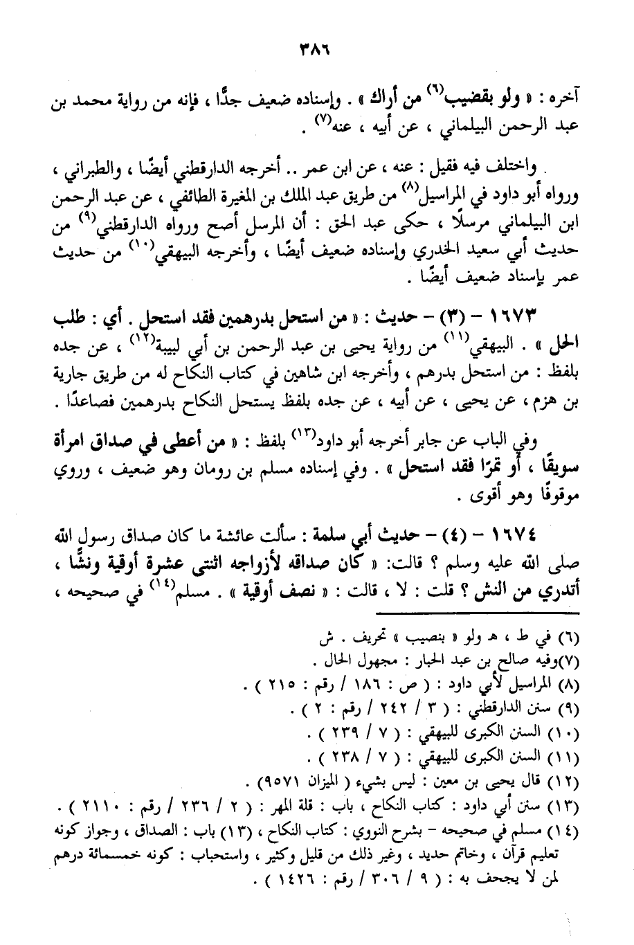 1673 - (3) - حَدِيثٌ: «مَنْ اسْتَحَلَّ بِدِرْهَمَيْنِ فَقَدْ اسْتَحَلَّ. أَيْ: طَلَبَ الْحِلَّ» . الْبَيْهَقِيُّ مِنْ رِوَايَةِ يَحْيَى بْنِ عَبْدِ الرَّحْمَنِ بْنِ أَبِي لَبِيبَةَ، عَنْ جَدِّهِ بِلَفْظِ: مَنْ اسْتَحَلَّ بِدِرْهَمٍ، وَأَخْرَجَهُ ابْنُ شَاهِينَ فِي كِتَابِ النِّكَاحِ لَهُ مِنْ طَرِيقِ جَارِيَةَ بْنِ هُزَمَ، عَنْ يَحْيَى، عَنْ أَبِيهِ، عَنْ جَدِّهِ بِلَفْظِ «يُسْتَحَلُّ النِّكَاحُ بِدِرْهَمَيْنِ فَصَاعِدًا» . وَفِي الْبَابِ عَنْ جَابِرٍ أَخْرَجَهُ أَبُو دَاوُد بِلَفْظِ: «مَنْ أَعْطَى فِي صَدَاقِ امْرَأَةٍ سَوِيقًا، أَوْ تَمْرًا فَقَدْ اسْتَحَلَّ» وَفِي إسْنَادِهِ مُسْلِمُ بْنُ رُومَانٍ وَهُوَ ضَعِيفٌ، وَرُوِيَ مَوْقُوفًا وَهُوَ أَقْوَى.