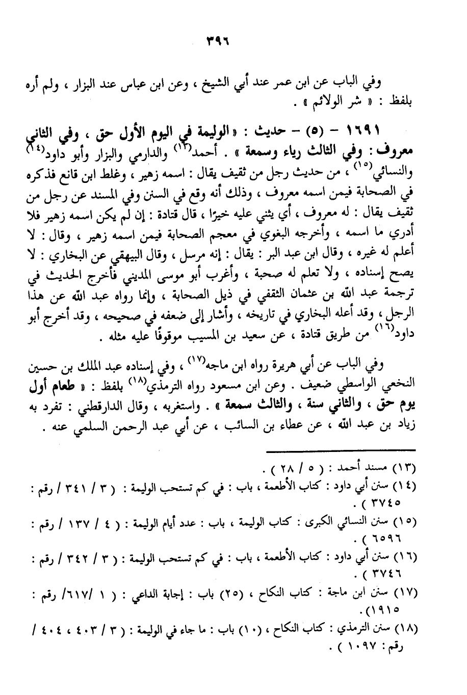 1691 - (5) - حَدِيثٌ: «الْوَلِيمَةُ فِي الْيَوْمِ الْأَوَّلِ حَقٌّ، وَفِي الثَّانِي مَعْرُوفٌ: وَفِي الثَّالِثِ رِيَاءٌ وَسُمْعَةٌ» أَحْمَدُ وَالدَّارِمِيُّ وَالْبَزَّارُ وَأَبُو دَاوُد وَالنَّسَائِيُّ، مِنْ حَدِيثِ رَجُلٍ مِنْ ثَقِيفٍ يُقَالُ: اسْمه زُهَيْرٌ، وَغَلَط ابْنُ قَانِعٍ فَذَكَرَهُ فِي الصَّحَابَةِ فِيمَنْ اسْمُهُ مَعْرُوفٌ، وَذَلِكَ أَنَّهُ وَقَعَ فِي السُّنَنِ وَفِي الْمُسْنَدِ عَنْ رَجُلٍ مِنْ ثَقِيفٍ يُقَالُ: لَهُ مَعْرُوفٌ، أَيْ يُثْنِي عَلَيْهِ خَيْرًا، قَالَ قَتَادَةُ: إنْ لَمْ يَكُنْ اسْمُهُ زُهَيْرٌ فَلَا أَدْرِي مَا اسْمُهُ، وَأَخْرَجَهُ الْبَغَوِيّ فِي مُعْجَمِ الصَّحَابَةِ فِيمَنْ اسْمُهُ زُهَيْرٌ.