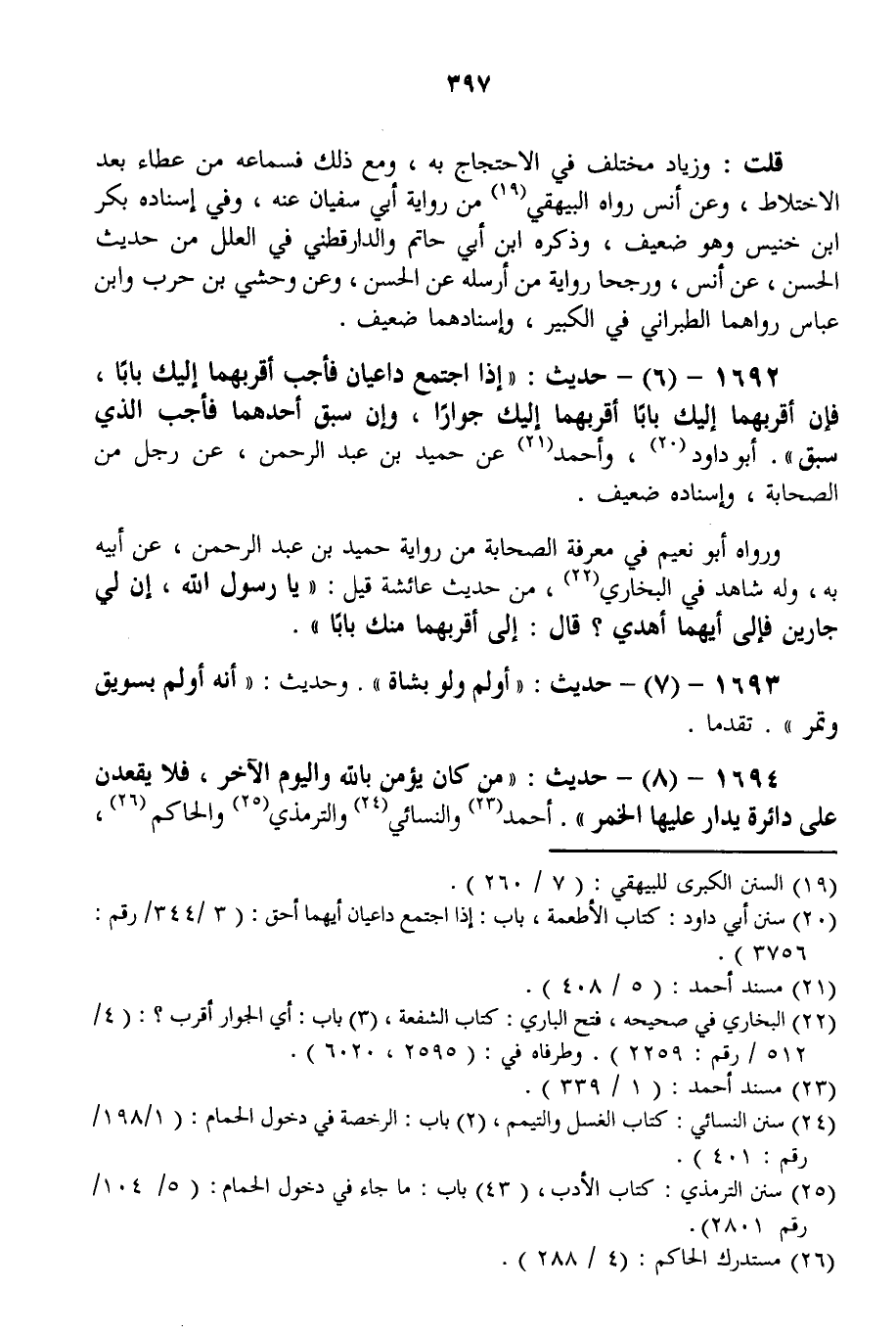 1692 - (6) - حَدِيثٌ: «إذَا اجْتَمَعَ دَاعِيَانِ فَأَجِبْ أَقْرَبَهُمَا إلَيْك بَابًا، فَإِنَّ أَقْرَبَهُمَا إلَيْك بَابًا أَقْرَبُهُمَا إلَيْك جِوَارًا، وَإِنْ سَبَقَ أَحَدُهُمَا فَأَجِبْ الَّذِي سَبَقَ» . أَبُو دَاوُد، وَأَحْمَدُ عَنْ حُمَيْدِ بْنِ عَبْدِ الرَّحْمَنِ، عَنْ رَجُلٍ مِنْ الصَّحَابَةِ، وَإِسْنَادُهُ ضَعِيفٌ. وَرَوَاهُ أَبُو نُعَيْمٍ فِي مَعْرِفَةِ الصَّحَابَةِ مِنْ رِوَايَةِ حُمَيْدُ بْنُ عَبْدِ الرَّحْمَنِ، عَنْ أَبِيهِ بِهِ، وَلَهُ شَاهِدٌ فِي الْبُخَارِيِّ، مِنْ حَدِيثِ عَائِشَةَ قِيلَ: «يَا رَسُولَ اللَّهِ، إنَّ لِي جَارَيْنِ فَإِلَى أَيِّهِمَا أُهْدِي؟ قَالَ: إلَى أَقْرَبِهِمَا مِنْك بَابًا» .