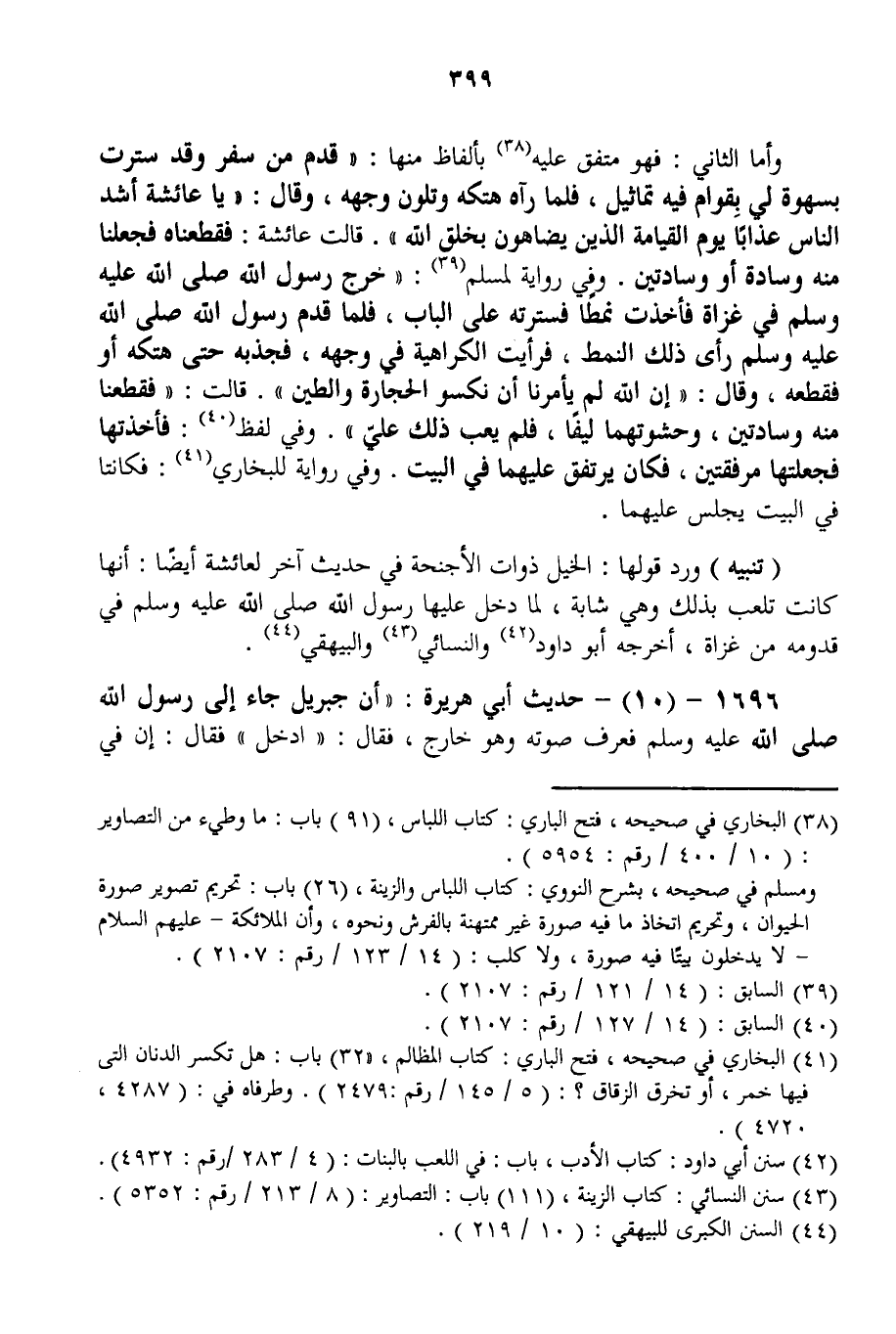 وَأَمَّا الثَّانِيَ: فَهُوَ مُتَّفَقٌ عَلَيْهِ بِأَلْفَاظٍ مِنْهَا: «قَدِمَ مِنْ سَفَرٍ وَقَدْ سَتَّرْتُ بِسَهْوَةٍ لِي بِقِرَامٍ فِيهِ تَمَاثِيلُ، فَلَمَّا رَآهُ هَتَكَهُ وَتَلَوَّنَ وَجْهُهُ، وَقَالَ: يَا عَائِشَةَ أَشَدُّ النَّاسِ عَذَابًا يَوْمَ الْقِيَامَةِ الَّذِينَ يُضَاهُونَ بِخَلْقِ اللَّهِ. قَالَتْ عَائِشَةُ: فَقَطَّعْنَاهُ فَجَعَلْنَا مِنْهُ وِسَادَةً أَوْ وِسَادَتَيْنِ» وَفِي رِوَايَةٍ لِمُسْلِمٍ: «خَرَجَ رَسُولُ اللَّهِ - صَلَّى اللَّهُ عَلَيْهِ وَسَلَّمَ - فِي غُزَاةِ فَأَخَذْت نَمَطًا فَسَتَرْته عَلَى الْبَابِ، فَلَمَّا قَدِمَ رَسُولُ اللَّهِ - صَلَّى اللَّهُ عَلَيْهِ وَسَلَّمَ - رَأَى ذَلِكَ النَّمَطَ، فَرَأَيْت الْكَرَاهِيَةَ فِي وَجْهِهِ، فَجَذَبَهُ حَتَّى هَتَكَهُ أَوْ فَقَطَّعَهُ، وَقَالَ: إنَّ اللَّهَ لَمْ يَأْمُرْنَا أَنْ نَكْسُوَ الْحِجَارَةَ وَالطِّينَ قَالَتْ: فَقَطَّعْنَا مِنْهُ وِسَادَتَيْنِ، وَحَشْوَتُهُمَا لِيفًا، فَلَمْ يَعِبْ ذَلِكَ عَلَيَّ» . وَفِي لَفْظٍ: «فَأَخَذْتهَا فَجَعَلْتهَا مُرْفَقَتَيْنِ، فَكَانَ يَرْتَفِقُ عَلَيْهِمَا فِي الْبَيْتِ» . وَفِي رِوَايَةٍ لِلْبُخَارِيِّ: «فَكَانَتَا فِي الْبَيْتِ يَجْلِسُ عَلَيْهِمَا» .