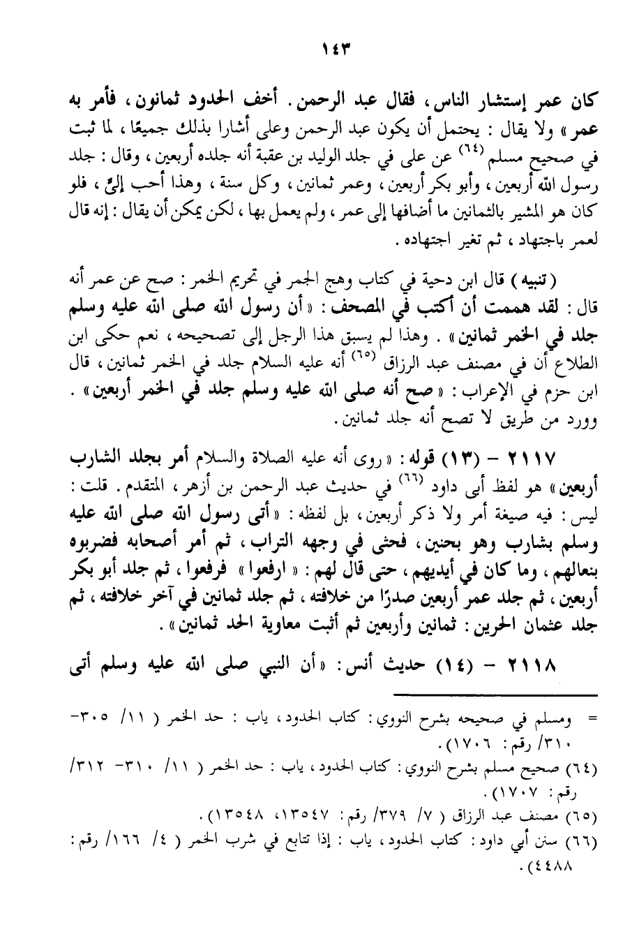 2117 - (13) قَوْلُهُ: رُوِيَ «أَنَّهُ - عَلَيْهِ الصَّلَاةُ وَالسَّلَامُ - أَمَرَ بِجَلْدِ الشَّارِبِ أَرْبَعِينَ» هُوَ لَفْظُ أَبِي دَاوُد فِي حَدِيثِ عَبْدِ الرَّحْمَنِ بْنِ أَزْهَرَ، الْمُتَقَدِّمِ. قُلْت: لَيْسَ: فِيهِ صِيغَةُ أَمْرٍ وَلَا ذِكْرُ أَرْبَعِينَ، بَلْ لَفْظُهُ: «أُتِيَ رَسُولُ اللَّهِ - صَلَّى اللَّهُ عَلَيْهِ وَسَلَّمَ - بِشَارِبٍ وَهُوَ بِحُنَيْنٍ، فَحَثَى فِي وَجْهِهِ التُّرَابَ، ثُمَّ أَمَرَ أَصْحَابَهُ فَضَرَبُوهُ بِنِعَالِهِمْ، وَمَا كَانَ فِي أَيْدِيهِمْ، حَتَّى قَالَ لَهُمْ: ارْفَعُوا فَرَفَعُوا، ثُمَّ جَلَدَ أَبُو بَكْرٍ أَرْبَعِينَ، ثُمَّ جَلَدَ عُمَرُ أَرْبَعِينَ صَدْرًا مِنْ خِلَافَتِهِ، ثُمَّ جَلَدَ ثَمَانِينَ فِي آخِرِ خِلَافَتِهِ، ثُمَّ جَلَدَ عُثْمَانُ الْحُرَّيْنِ: ثَمَانِينَ وَأَرْبَعِينَ ثُمَّ أَثْبَتَ مُعَاوِيَةُ الْحَدَّ ثَمَانِينَ» .