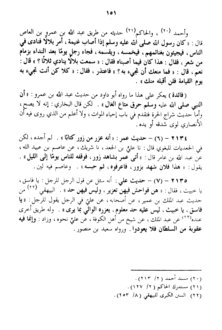 وَأَحْمَدُ، وَالْحَاكِمُ حَدِيثَهُ مِنْ طَرِيقِ عَبْدِ اللَّهِ بْنِ عَمْرِو بْنِ الْعَاصِ قَالَ: «كَانَ رَسُولُ اللَّهِ - صَلَّى اللَّهُ عَلَيْهِ وَسَلَّمَ - إذَا أَصَابَ غَنِيمَةً، أَمَرَ بِلَالًا فَنَادَى فِي النَّاسِ، فَيَجِيئُونَ بِغَنَائِمِهِمْ، فَيُخَمِّسُهُ، وَيَقْسِمُهُ، فَجَاءَ رَجُلٌ يَوْمًا بَعْدَ النِّدَاءِ بِزِمَامٍ مِنْ شَعْرٍ، فَقَالَ: هَذَا كَانَ فِيمَا أَصَبْنَاهُ فَقَالَ: سَمِعْت بِلَالًا يُنَادِي ثَلَاثًا؟ قَالَ: نَعَمْ، قَالَ: فَمَا مَنَعَك أَنْ تَجِيءَ بِهِ؟ فَاعْتَذَرَ، فَقَالَ: كَلًّا كُنْ أَنْتَ تَجِيءُ بِهِ يَوْمَ الْقِيَامَةِ فَلَنْ أَقْبَلَهُ مِنْك» .