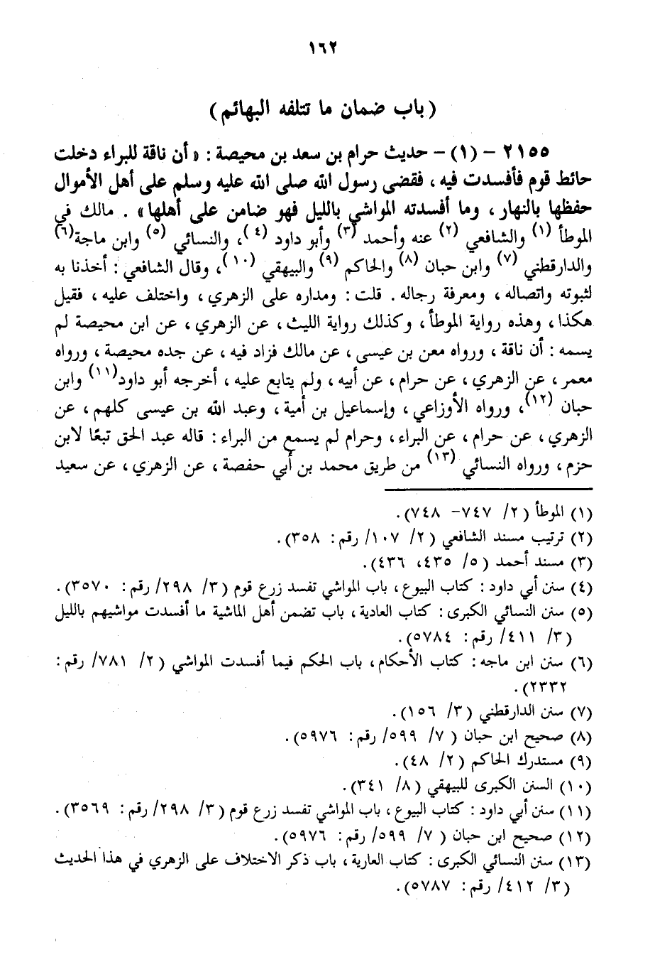 2155 - (1) - حَدِيثُ حَرَامِ بْنِ سَعْدِ بْنِ مُحَيِّصَةَ: «أَنَّ نَاقَةً لِلْبَرَاءِ دَخَلْت حَائِطَ قَوْمٍ فَأَفْسَدْت فِيهِ، فَقَضَى رَسُولُ اللَّهِ - صَلَّى اللَّهُ عَلَيْهِ وَسَلَّمَ - عَلَى أَهْلِ الْأَمْوَالِ حِفْظَهَا بِالنَّهَارِ، وَمَا أَفْسَدَتْهُ الْمَوَاشِي بِاللَّيْلِ فَهُوَ ضَامِنٌ عَلَى أَهْلِهَا» . مَالِكٌ فِي الْمُوَطَّأِ وَالشَّافِعِيُّ عَنْهُ وَأَحْمَدُ وَأَبُو دَاوُد، وَالنَّسَائِيُّ وَابْنُ مَاجَهْ وَالدَّارَقُطْنِيّ وَابْنُ حِبَّانَ وَالْحَاكِمُ وَالْبَيْهَقِيُّ، وَقَالَ الشَّافِعِيُّ: أَخَذْنَا بِهِ لِثُبُوتِهِ وَاتِّصَالِهِ، وَمَعْرِفَةِ رِجَالِهِ. قُلْت: وَمَدَارُهُ عَلَى الزُّهْرِيِّ، وَاخْتُلِفَ عَلَيْهِ، فَقِيلَ هَكَذَا، وَهَذِهِ رِوَايَةُ الْمُوَطَّأِ، وَكَذَلِكَ رِوَايَةُ اللَّيْثِ، عَنْ الزُّهْرِيِّ، عَنْ ابْنِ مُحَيِّصَةَ لَمْ يُسَمِّهِ: أَنَّ نَاقَةً، وَرَوَاهُ مَعْنُ بْنُ عِيسَى، عَنْ مَالِكٍ فَزَادَ فِيهِ، عَنْ جَدِّهِ مُحَيِّصَةَ، وَرَوَاهُ مَعْمَرٌ، عَنْ الزُّهْرِيِّ، عَنْ حَرَامٍ، عَنْ أَبِيهِ، وَلَمْ يُتَابَعْ عَلَيْهِ، أَخْرَجَهُ أَبُو دَاوُد وَابْنُ حِبَّانَ، وَرَوَاهُ الْأَوْزَاعِيُّ، وَإِسْمَاعِيلُ بْنُ أُمَيَّةَ، وَعَبْدُ اللَّهِ بْنُ عِيسَى كُلُّهُمْ، عَنْ الزُّهْرِيِّ، عَنْ حَرَامٍ، عَنْ الْبَرَاءِ، وَحَرَامٌ لَمْ يَسْمَعْ مِنْ الْبَرَاءِ: قَالَهُ عَبْدُ الْحَقِّ تَبَعًا لِابْنِ حَزْمٍ، وَرَوَاهُ النَّسَائِيُّ مِنْ طَرِيقِ مُحَمَّدِ بْنِ أَبِي حَفْصَةَ، عَنْ الزُّهْرِيِّ، عَنْ سَعِيدِ بْنِ الْمُسَيِّبِ،