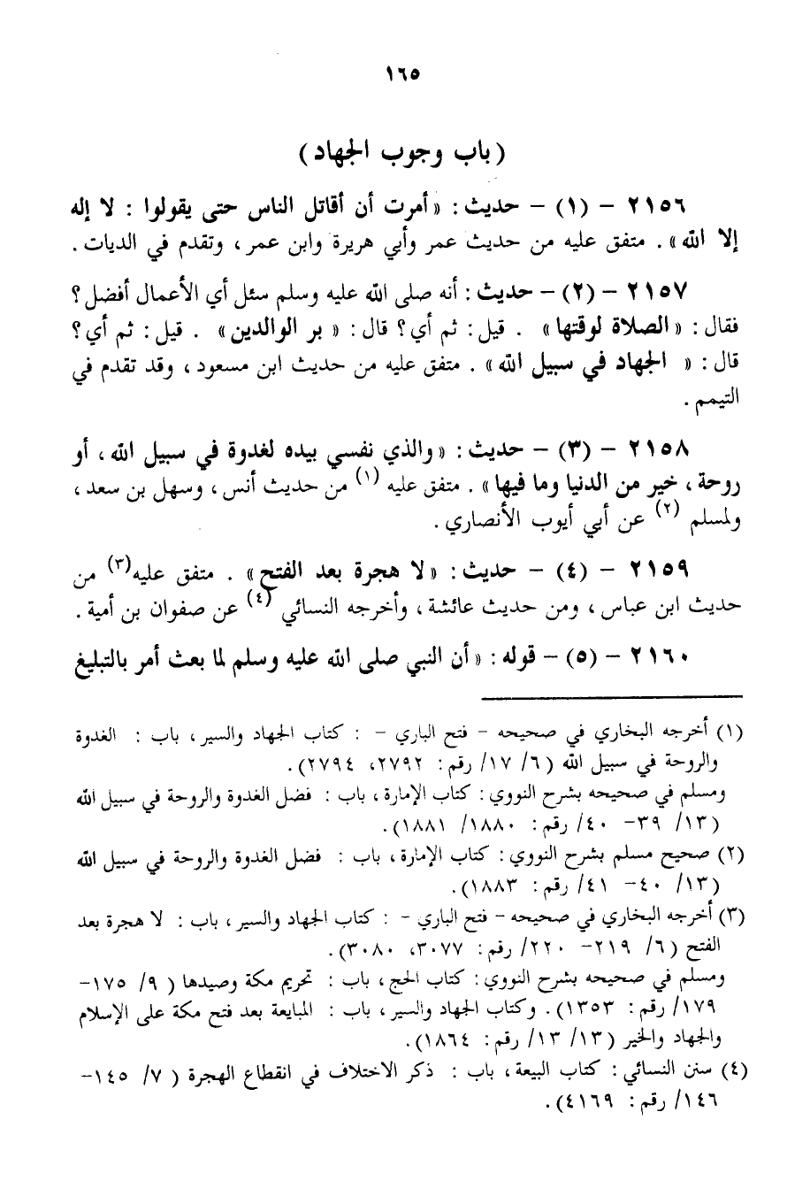 2159 - (5) - حَدِيثٌ: «لَا هِجْرَةَ بَعْدَ الْفَتْحِ» . مُتَّفَقٌ عَلَيْهِ مِنْ حَدِيثِ ابْنِ عَبَّاسٍ، وَمِنْ حَدِيثِ عَائِشَةَ، وَأَخْرَجَهُ النَّسَائِيُّ عَنْ صَفْوَانَ بْنِ أُمَيَّةَ.