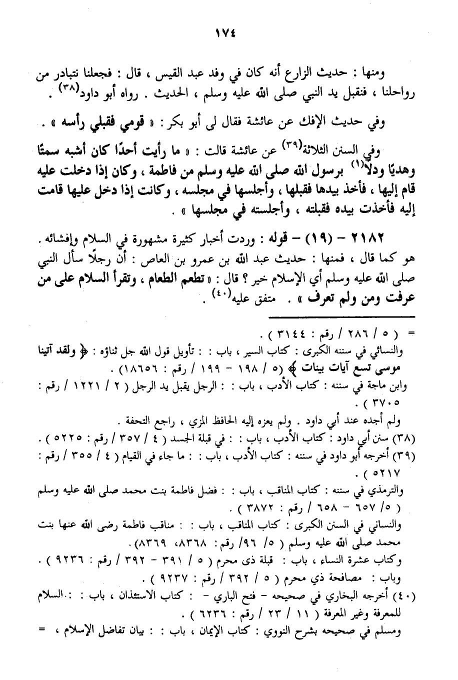 2182 - (19) - قَوْلُهُ: وَرَدَتْ أَخْبَارٌ كَثِيرَةٌ مَشْهُورَةٌ فِي السَّلَامِ وَإِفْشَائِهِ. هُوَ كَمَا قَالَ، فَمِنْهَا: حَدِيثُ عَبْدِ اللَّهِ بْنِ عَمْرِو بْنِ الْعَاصِ: «أَنَّ رَجُلًا سَأَلَ النَّبِيَّ - صَلَّى اللَّهُ عَلَيْهِ وَسَلَّمَ - أَيُّ الْإِسْلَامِ خَيْرٌ؟ قَالَ: تُطْعِمُ الطَّعَامَ، وَتَقْرَأُ السَّلَامَ عَلَى مَنْ عَرَفْت وَمَنْ وَلَمْ تَعْرِفْ» . مُتَّفَقٌ عَلَيْهِ.