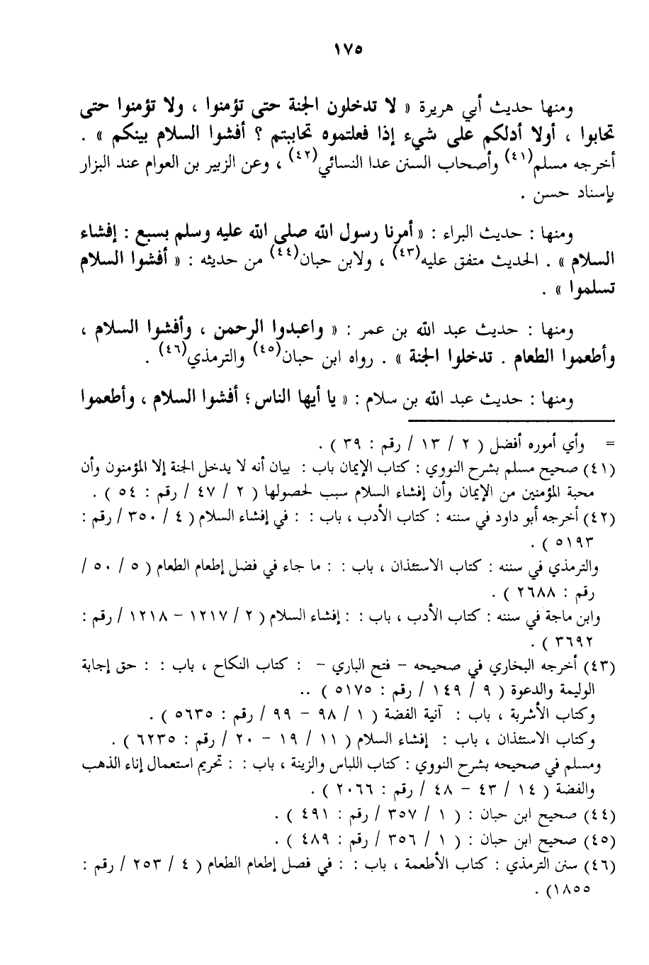 وَمِنْهَا حَدِيثُ أَبِي هُرَيْرَةَ «لَا تَدْخُلُونَ الْجَنَّةَ حَتَّى تُؤْمِنُوا، وَلَا تُؤْمِنُوا حَتَّى تَحَابُّوا، أَوَلَا أَدُلُّكُمْ عَلَى شَيْءٍ إذَا فَعَلْتُمُوهُ تَحَابَبْتُمْ؟ أَفْشُوا السَّلَامَ بَيْنَكُمْ» . أَخْرَجَهُ مُسْلِمٌ وَأَصْحَابُ السُّنَنِ عَدَا النَّسَائِيّ، وَعَنْ الزُّبَيْرِ بْنِ الْعَوَّامِ عِنْدَ الْبَزَّارِ بِإِسْنَادٍ حَسَنٍ. وَمِنْهَا: حَدِيثُ الْبَرَاءِ: «أَمَرَنَا رَسُولُ اللَّهِ - صَلَّى اللَّهُ عَلَيْهِ وَسَلَّمَ - بِسَبْعٍ: إفْشَاءِ السَّلَامِ» . الْحَدِيثُ مُتَّفَقٌ عَلَيْهِ، وَلِابْنِ حِبَّانَ مِنْ حَدِيثِهِ: «أَفْشُوا السَّلَامَ تُسْلِمُوا» .
