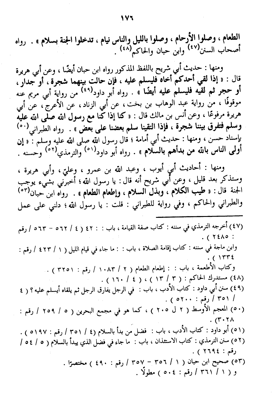 الطَّعَامَ، وَصِلُوا الْأَرْحَامَ، وَصَلُّوا بِاللَّيْلِ وَالنَّاسُ نِيَامٌ، تَدْخُلُوا الْجَنَّةَ بِسَلَامٍ» . رَوَاهُ أَصْحَابُ السُّنَنِ وَابْنُ حِبَّانَ وَالْحَاكِمُ.