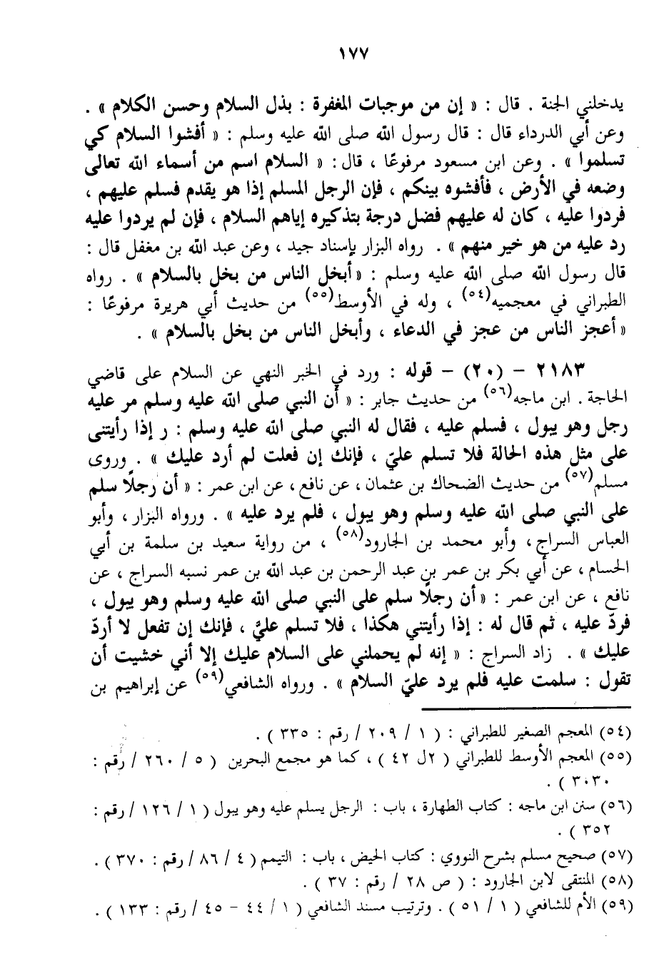 2183 - (20) - قَوْلُهُ: وَرَدَ فِي الْخَبَرِ النَّهْيُ عَنْ السَّلَامِ عَلَى قَاضِي الْحَاجَةِ. ابْنُ مَاجَهْ مِنْ حَدِيثِ جَابِرٍ: «أَنَّ النَّبِيَّ - صَلَّى اللَّهُ عَلَيْهِ وَسَلَّمَ - مَرَّ عَلَيْهِ رَجُلٌ وَهُوَ يَبُولُ، فَسَلَّمَ عَلَيْهِ، فَقَالَ لَهُ النَّبِيُّ - صَلَّى اللَّهُ عَلَيْهِ وَسَلَّمَ -: إذَا رَأَيْتنِي عَلَى مِثْلِ هَذِهِ الْحَالَةِ فَلَا تُسَلِّمْ عَلَيَّ، فَإِنَّك إنْ فَعَلْت لَمْ أَرُدَّ عَلَيْك» .