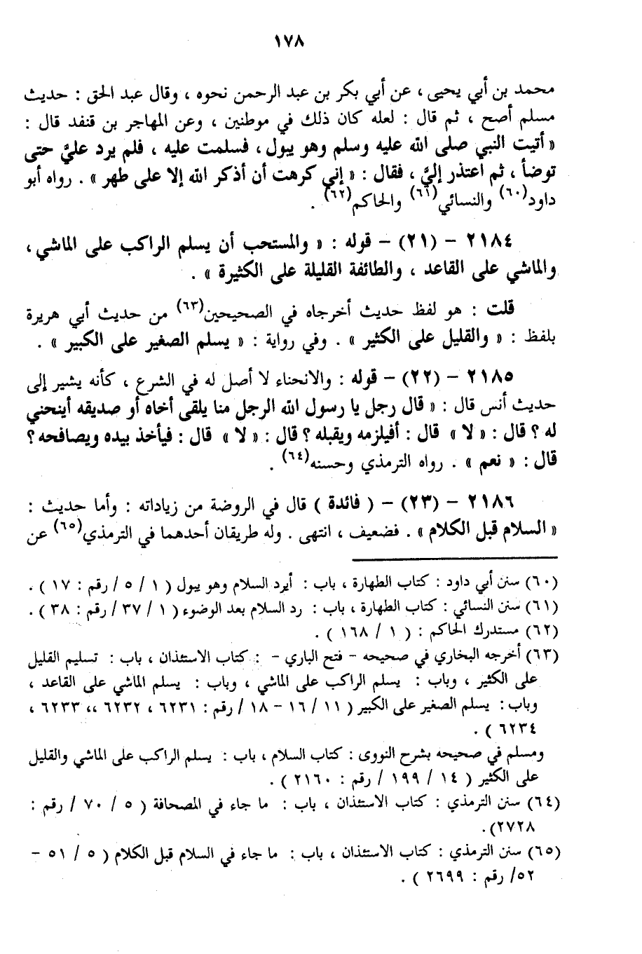 2184 - (21) - قَوْلُهُ: " وَالْمُسْتَحَبُّ أَنْ يُسَلِّمَ الرَّاكِبُ عَلَى الْمَاشِي، وَالْمَاشِي عَلَى الْقَاعِدِ، وَالطَّائِفَةُ الْقَلِيلَةُ عَلَى الْكَثِيرَةِ ". قُلْت: هُوَ لَفْظُ حَدِيثٍ أَخْرَجَاهُ فِي الصَّحِيحَيْنِ مِنْ حَدِيثِ أَبِي هُرَيْرَةَ بِلَفْظِ: «وَالْقَلِيلُ عَلَى الْكَثِيرِ» . وَفِي رِوَايَةٍ: «يُسَلِّمُ الصَّغِيرُ عَلَى الْكَبِيرِ» .
