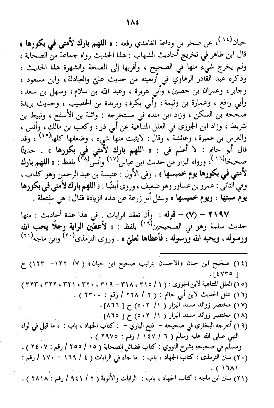 عَنْ صَخْرِ بْنِ وَدَاعَةَ الْغَامِدِيِّ رَفَعَهُ: «اللَّهُمَّ بَارِكْ لِأُمَّتِي فِي بُكُورِهَا» قَالَ ابْنُ طَاهِرٍ فِي تَخْرِيجِ أَحَادِيثِ الشِّهَابِ: هَذَا الْحَدِيثُ رَوَاهُ جَمَاعَةٌ مِنْ الصَّحَابَةِ، وَلَمْ يَخْرُجْ شَيْءٌ مِنْهَا فِي الصَّحِيحِ، وَأَقْرَبُهَا إلَى الصِّحَّةِ وَالشُّهْرَةِ هَذَا الْحَدِيثُ، وَذَكَرَهُ عَبْدُ الْقَادِرِ الرَّهَاوِيُّ فِي أَرْبَعِينِهِ مِنْ حَدِيثِ عَلِيٍّ وَالْعَبَادِلَةِ، وَابْنِ مَسْعُودٍ، وَجَابِرٍ، وَعِمْرَانَ بْنِ حُصَيْنٍ، وَأَبِي هُرَيْرَةَ، وَعَبْدِ اللَّهِ بْنِ سَلَامٍ، وَسَهْلِ بْنِ سَعْدٍ، وَأَبِي رَافِعٍ، وَعُمَارَةَ بْنِ وَثِيمَةَ، وَأَبِي بَكْرَةَ، وَبُرَيْدَةَ بْنِ الْحُصَيْبِ، وَحَدِيثُ بُرَيْدَةَ صَحَّحَهُ ابْنُ السَّكَنِ، وَزَادَ ابْنُ مَنْدَهْ فِي مُسْتَخْرَجِهِ: وَاثِلَةَ بْنَ الْأَسْقَعِ، وَنُبَيْطَ بْنَ شَرِيطٍ، وَزَادَ ابْنُ الْجَوْزِيِّ فِي الْعِلَلِ الْمُتَنَاهِيَةِ عَنْ أَبِي ذَرٍّ، وَكَعْبِ بْنِ مَالِكٍ، وَأَنَسٍ، وَالْغَرْسِ بْنِ عُمَيْرَةَ، وَعَائِشَةِ، وَقَالَ: لَا يَثْبُتُ مِنْهَا شَيْءٌ، وَضَعَّفَهَا كُلَّهَا.
