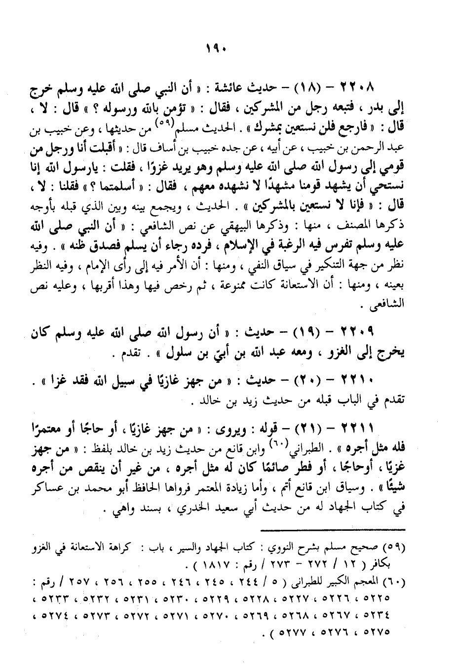 حَدِيثُ عَائِشَةَ: «أَنَّ النَّبِيَّ - صَلَّى اللَّهُ عَلَيْهِ وَسَلَّمَ - خَرَجَ إلَى بَدْرٍ، فَتَبِعَهُ رَجُلٌ مِنْ الْمُشْرِكِينَ، فَقَالَ: تُؤْمِنُ بِاَللَّهِ وَرَسُولِهِ؟ قَالَ: لَا، قَالَ: فَارْجِعْ فَلَنْ نَسْتَعِينَ بِمُشْرِكٍ» . الْحَدِيثَ مُسْلِمٌ مِنْ حَدِيثِهَا، وَعَنْ خَبِيبِ بْنِ عَبْدِ الرَّحْمَنِ بْنِ خَبِيبٍ، عَنْ أَبِيهِ، عَنْ جَدِّهِ خَبِيبِ بْنِ إسَافٍ قَالَ: «أَقْبَلْت أَنَا وَرَجُلٌ مِنْ قَوْمِي إلَى رَسُولِ اللَّهِ - صَلَّى اللَّهُ عَلَيْهِ وَسَلَّمَ - وَهُوَ يُرِيدُ غَزْوًا، فَقُلْت: يَا رَسُولَ اللَّهِ إنَّا نَسْتَحْيِيَ أَنْ يَشْهَدَ قَوْمُنَا مَشْهَدًا لَا نَشْهَدُهُ مَعَهُمْ، فَقَالَ: أَسْلَمْتُمَا؟ فَقُلْنَا: لَا، قَالَ: فَإِنَّا لَا نَسْتَعِينُ بِالْمُشْرِكِينَ» . الْحَدِيثَ، وَيُجْمَعُ بَيْنَهُ وَبَيْنَ الَّذِي قَبْلَهُ بِأَوْجُهٍ ذَكَرَهَا الْمُصَنِّفُ، مِنْهَا: وَذَكَرَهَا الْبَيْهَقِيُّ عَنْ نَصِّ الشَّافِعِيِّ: «أَنَّ النَّبِيَّ - صَلَّى اللَّهُ عَلَيْهِ وَسَلَّمَ - تَفَرَّسَ فِيهِ الرَّغْبَةَ فِي الْإِسْلَامِ، فَرَدَّهُ رَجَاءَ أَنْ يُسْلِمَ فَصَدَقَ ظَنُّهُ» وَفِيهِ نَظَرٌ مِنْ جِهَةِ التَّنْكِيرِ فِي سِيَاقِ النَّفْيِ، وَمِنْهَا: أَنَّ الْأَمْرَ فِيهِ إلَى رَأْيِ الْإِمَامِ، وَفِيهِ النَّظَرُ بِعَيْنِهِ، وَمِنْهَا: أَنَّ الِاسْتِعَانَةَ كَانَتْ مَمْنُوعَةً، ثُمَّ رُخِّصَ فِيهَا وَهَذَا أَقْرَبُهَا، وَعَلَيْهِ نَصَّ الشَّافِعِيُّ.