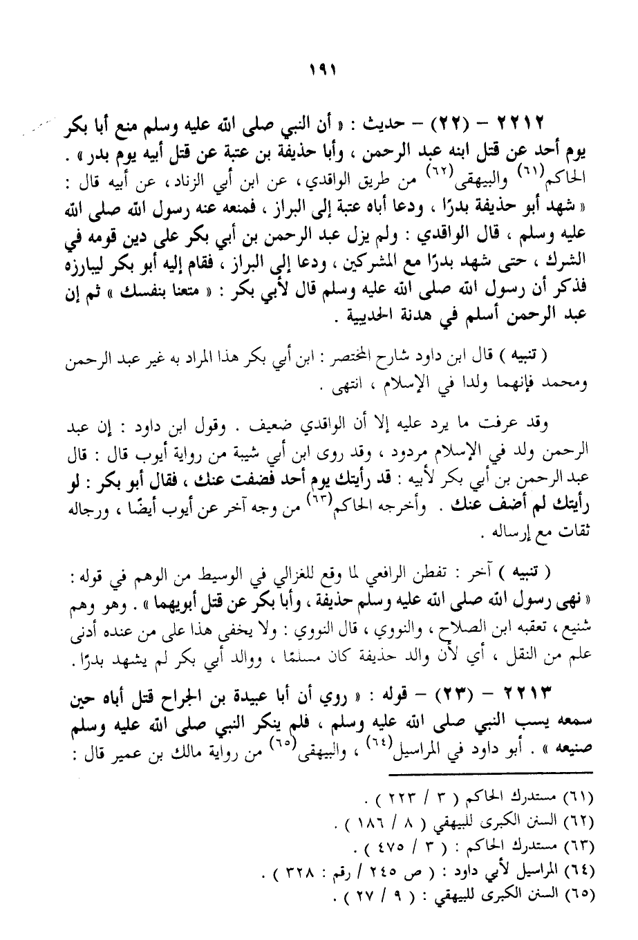 حَدِيثٌ: «أَنَّ النَّبِيَّ - صَلَّى اللَّهُ عَلَيْهِ وَسَلَّمَ - مَنَعَ أَبَا بَكْرٍ يَوْمَ أُحُدٍ عَنْ قَتْلِ ابْنِهِ عَبْدِ الرَّحْمَنِ، وَأَبُو حُذَيْفَةَ بْنِ عُتْبَةَ عَنْ قَتْلِ أَبِيهِ يَوْمَ بَدْرٍ» . الْحَاكِمُ وَالْبَيْهَقِيُّ مِنْ طَرِيقِ الْوَاقِدِيِّ، عَنْ ابْنِ أَبِي الزِّنَادِ، عَنْ أَبِيهِ قَالَ: «شَهِدَ أَبُو حُذَيْفَةَ بَدْرًا، وَدَعَا أَبَاهُ عُتْبَةَ إلَى الْبِرَازِ، فَمَنَعَهُ عَنْهُ رَسُولُ اللَّهِ - صَلَّى اللَّهُ عَلَيْهِ وَسَلَّمَ -» ، قَالَ الْوَاقِدِيُّ: «وَلَمْ يَزَلْ عَبْدُ الرَّحْمَنِ بْنُ أَبِي بَكْرٍ عَلَى دِينِ قَوْمِهِ فِي الشِّرْكِ، حَتَّى شَهِدَ بَدْرًا مَعَ الْمُشْرِكِينَ، وَدَعَا إلَى الْبِرَازِ، فَقَامَ إلَيْهِ أَبُو بَكْرٍ لِيُبَارِزَهُ فَذَكَرَ أَنَّ رَسُولَ اللَّهِ - صَلَّى اللَّهُ عَلَيْهِ وَسَلَّمَ - قَالَ لِأَبِي بَكْرٍ: مَتِّعْنَا بِنَفْسِك» ثُمَّ إنَّ عَبْدَ الرَّحْمَنِ أَسْلَمَ فِي هُدْنَةِ الْحُدَيْبِيَةِ.