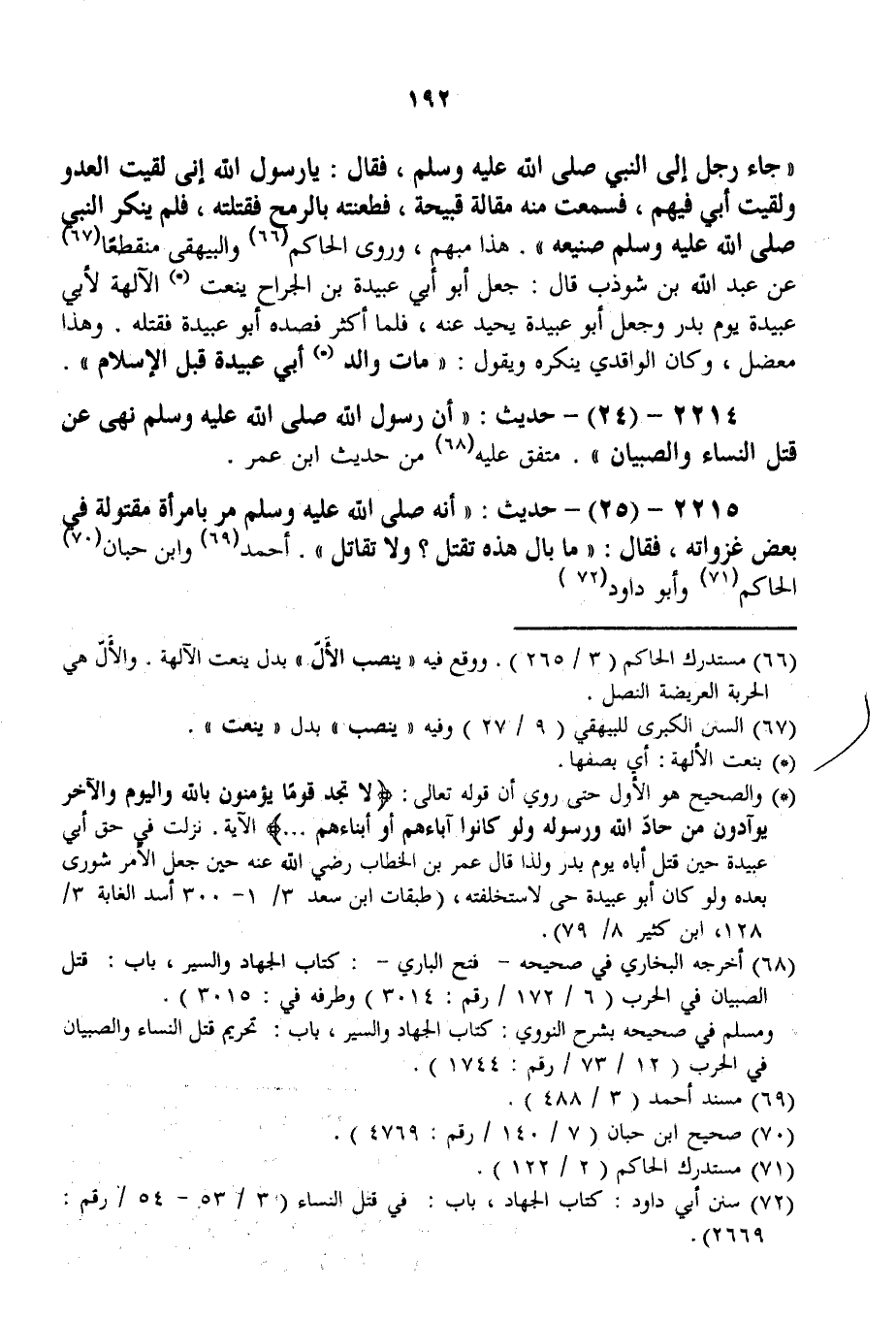 «جَاءَ رَجُلٌ إلَى النَّبِيِّ - صَلَّى اللَّهُ عَلَيْهِ وَسَلَّمَ -، فَقَالَ: يَا رَسُولَ اللَّهِ إنِّي لَقِيت الْعَدُوَّ وَلَقِيت أَبِي فِيهِمْ، فَسَمِعْت مِنْهُ مَقَالَةً قَبِيحَةً، فَطَعَنْته بِالرُّمْحِ فَقَتَلْته، فَلَمْ يُنْكِرْ النَّبِيُّ - صَلَّى اللَّهُ عَلَيْهِ وَسَلَّمَ - صَنِيعَهُ» . هَذَا مُبْهَمٌ، وَرَوَى الْحَاكِمُ وَالْبَيْهَقِيُّ مُنْقَطِعًا عَنْ عَبْدِ اللَّهِ بْنِ شَوْذَبٍ قَالَ: جَعَلَ أَبُو أَبِي عُبَيْدَةِ بْنِ الْجَرَّاحِ يَنْعَتُ الْآلِهَةَ لِأَبِي عُبَيْدَةَ يَوْمَ بَدْرٍ وَجَعَلَ أَبُو عُبَيْدَةَ يَحِيدُ عَنْهُ، فَلَمَّا أَكْثَرَ فَصَدَّهُ أَبُو عُبَيْدَةَ فَقَتَلَهُ. وَهَذَا مُعْضِلٌ، وَكَانَ الْوَاقِدِيُّ يُنْكِرُهُ وَيَقُولُ: " مَاتَ وَالِدُ أَبِي عُبَيْدَةَ قَبْلَ الْإِسْلَامِ "