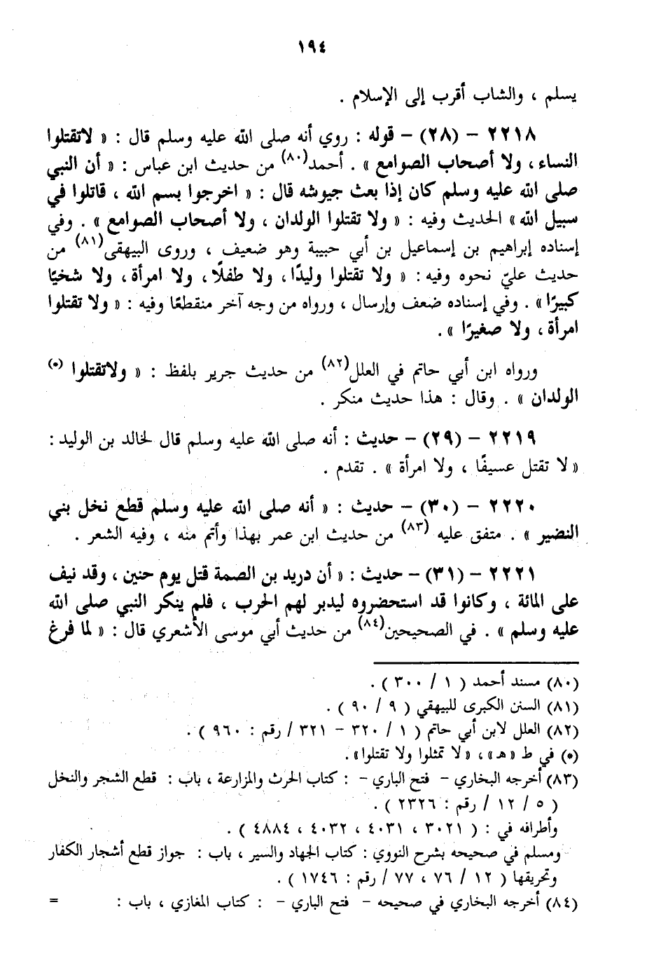 2218 - (28) - قَوْلُهُ: رُوِيَ «أَنَّهُ - صَلَّى اللَّهُ عَلَيْهِ وَسَلَّمَ - قَالَ: لَا تَقْتُلُوا النِّسَاءَ، وَلَا أَصْحَابَ الصَّوَامِعِ» . أَحْمَدُ مِنْ حَدِيثِ ابْنِ عَبَّاسٍ: «أَنَّ النَّبِيَّ - صَلَّى اللَّهُ عَلَيْهِ وَسَلَّمَ - كَانَ إذَا بَعَثَ جُيُوشَهُ قَالَ: اُخْرُجُوا بِسْمِ اللَّهِ، قَاتِلُوا فِي سَبِيلِ اللَّهِ الْحَدِيثَ وَفِيهِ: وَلَا تَقْتُلُوا الْوِلْدَانَ، وَلَا أَصْحَابَ الصَّوَامِعِ» . وَفِي إسْنَادِهِ إبْرَاهِيمُ بْنُ إسْمَاعِيلَ بْنِ أَبِي حَبِيبَةَ وَهُوَ ضَعِيفٌ، وَرَوَى الْبَيْهَقِيُّ مِنْ حَدِيثِ عَلِيٍّ نَحْوَهُ وَفِيهِ: «وَلَا تَقْتُلُوا وَلِيدًا، وَلَا طِفْلًا، وَلَا امْرَأَةً، وَلَا شَيْخًا كَبِيرًا» . وَفِي إسْنَادِهِ ضَعْفٌ وَإِرْسَالٌ، وَرَوَاهُ مِنْ وَجْهٍ آخَرَ مُنْقَطِعًا وَفِيهِ: «وَلَا تَقْتُلُوا امْرَأَةً، وَلَا صَغِيرًا» . وَرَوَاهُ ابْنُ أَبِي حَاتِمٍ فِي الْعِلَلِ مِنْ حَدِيثِ جَرِيرٍ بِلَفْظِ: «وَلَا تَقْتُلُوا الْوِلْدَانَ» . وَقَالَ: هَذَا حَدِيثٌ مُنْكَرٌ. 2219 - (29) - حَدِيثٌ: «أَنَّهُ - صَلَّى اللَّهُ عَلَيْهِ وَسَلَّمَ - قَالَ لِخَالِدِ بْنِ الْوَلِيدِ: لَا تَقْتُلْ عَسِيفًا، وَلَا امْرَأَةً» . تَقَدَّمَ. 2220 - (30) - حَدِيثٌ: «أَنَّهُ - صَلَّى اللَّهُ عَلَيْهِ وَسَلَّمَ - قَطَعَ نَخْلَ بَنِي النَّضِيرِ» . مُتَّفَقٌ عَلَيْهِ مِنْ حَدِيثِ ابْنِ عُمَرَ بِهَذَا وَأَتَمُّ مِنْهُ، وَفِيهِ الشِّعْرُ.