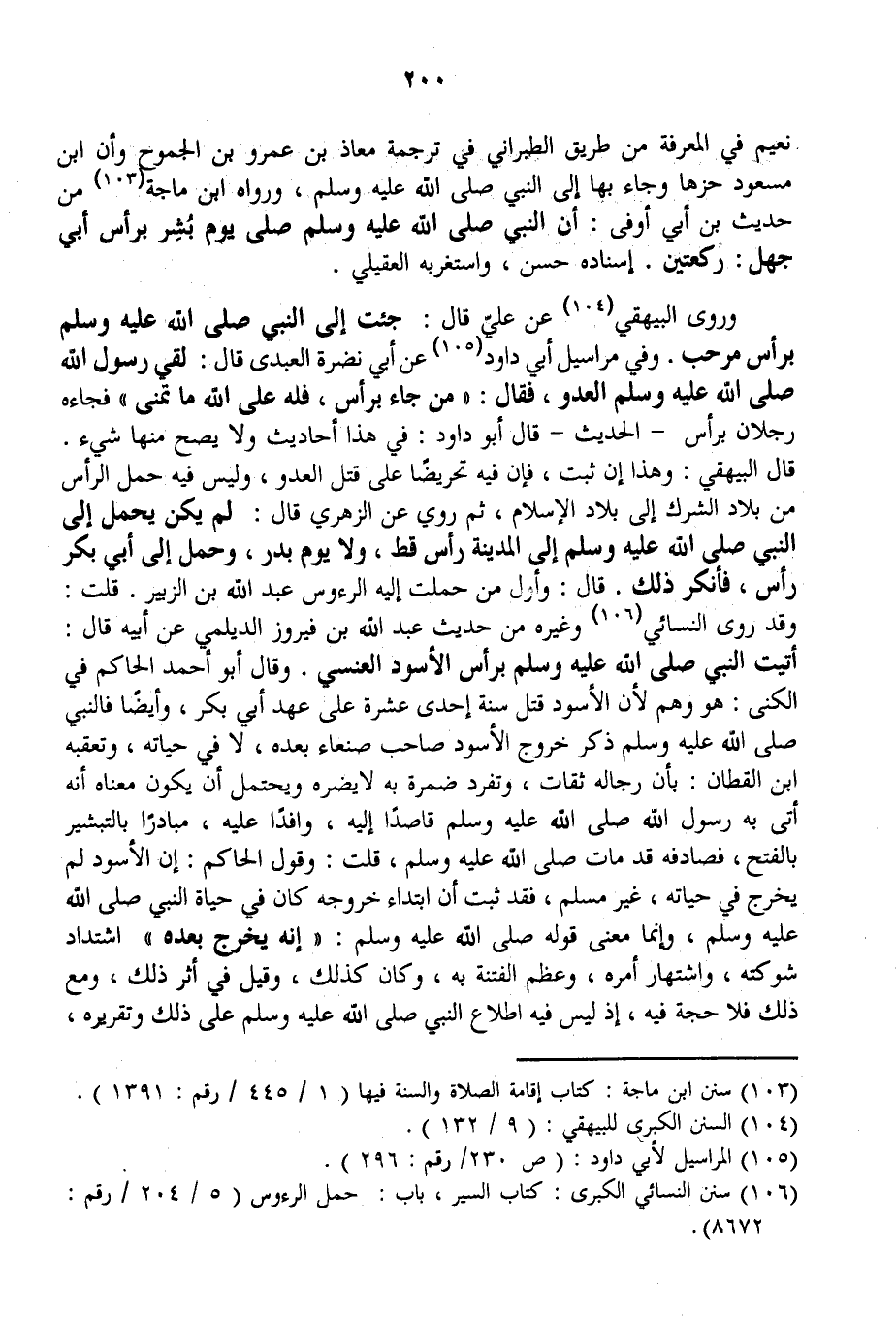 وَرَوَى الْبَيْهَقِيُّ «عَنْ عَلِيٍّ قَالَ: جِئْت إلَى النَّبِيِّ - صَلَّى اللَّهُ عَلَيْهِ وَسَلَّمَ - بِرَأْسِ مَرْحَبٍ» . وَفِي مَرَاسِيلِ أَبِي دَاوُد عَنْ أَبِي نَضْرَةَ الْعَبْدِيِّ قَالَ: «لَقِيَ رَسُولُ اللَّهِ - صَلَّى اللَّهُ عَلَيْهِ وَسَلَّمَ - الْعَدُوَّ، فَقَالَ: مَنْ جَاءَ بِرَأْسٍ، فَلَهُ عَلَى اللَّهِ مَا تَمَنَّى فَجَاءَهُ رَجُلَانِ بِرَأْسٍ -» الْحَدِيثَ - قَالَ أَبُو دَاوُد: فِي هَذَا أَحَادِيثُ وَلَا يَصِحُّ مِنْهَا شَيْءٌ. قَالَ الْبَيْهَقِيُّ: وَهَذَا إنْ ثَبَتَ، فَإِنَّ فِيهِ تَحْرِيضًا عَلَى قَتْلِ الْعَدُوِّ، وَلَيْسَ فِيهِ حَمْلُ الرَّأْسِ مِنْ بِلَادِ الشِّرْكِ إلَى بِلَادِ الْإِسْلَامِ، ثُمَّ رُوِيَ عَنْ الزُّهْرِيِّ قَالَ: «لَمْ يَكُنْ يُحْمَلُ إلَى النَّبِيِّ - صَلَّى اللَّهُ عَلَيْهِ وَسَلَّمَ - إلَى الْمَدِينَةِ رَأْسٌ قَطُّ، وَلَا يَوْمَ بَدْرٍ» ، وَحُمِلَ إلَى أَبِي بَكْرٍ رَأْسٌ، فَأَنْكَرَ ذَلِكَ. قَالَ: وَأَوَّلُ مَنْ حُمِلَتْ إلَيْهِ الرُّءُوسُ عَبْدُ اللَّهِ بْنُ الزُّبَيْرِ. قُلْت: وَقَدْ رَوَى النَّسَائِيُّ وَغَيْرُهُ مِنْ حَدِيثِ عَبْدِ اللَّهِ بْنِ فَيْرُوزَ الدَّيْلَمِيِّ عَنْ أَبِيهِ قَالَ: «أَتَيْت النَّبِيَّ - صَلَّى اللَّهُ عَلَيْهِ وَسَلَّمَ - بِرَأْسِ الْأَسْوَدِ الْعَنْسِيِّ» .