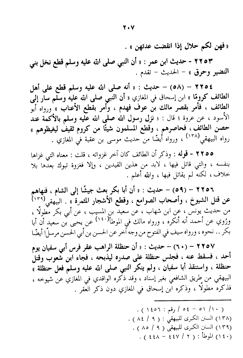 2254 - (58) - حَدِيثُ: «أَنَّهُ - صَلَّى اللَّهُ عَلَيْهِ وَسَلَّمَ - قَطَعَ عَلَى أَهْلِ الطَّائِفِ كُرُومًا» ابْنُ إِسْحَاقَ فِي الْمَغَازِي «أَنَّ النَّبِيَّ - صَلَّى اللَّهُ عَلَيْهِ وَسَلَّمَ - سَارَ إلَى الطَّائِفِ، فَأَمَرَ بِقَصْرِ مَالِكِ بْنِ عَوْفٍ فَهُدِمَ، وَأَمَرَ بِقَطْعِ الْأَعْنَابِ» وَرَوَاهُ أَبُو الْأَسْوَدِ، عَنْ عُرْوَةَ؛ قَالَ: «نَزَلَ رَسُولُ اللَّهِ - صَلَّى اللَّهُ عَلَيْهِ وَسَلَّمَ - بِالْأَكَمَةِ عِنْدَ حِصْنِ الطَّائِفِ، فَحَاصَرَهُمْ، وَقَطَعَ الْمُسْلِمُونَ شَيْئًا مِنْ كُرُومِ ثَقِيفَ لِيَغِيظُوهُمْ» رَوَاهُ الْبَيْهَقِيُّ، وَرَوَاهُ أَيْضًا مِنْ حَدِيثِ مُوسَى بْنِ عُقْبَةَ فِي الْمَغَازِي.