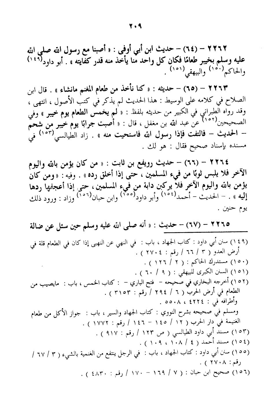 2262 - (64) - حَدِيثُ ابْنِ أَبِي أَوْفَى: «أَصَبْنَا مَعَ رَسُولِ اللَّهِ - صَلَّى اللَّهُ عَلَيْهِ وَسَلَّمَ - بِخَيْبَرَ طَعَامًا فَكَانَ كُلُّ وَاحِدٍ مِنَّا يَأْخُذُ مِنْهُ قَدْرَ كِفَايَتِهِ» . أَبُو دَاوُد وَالْحَاكِمُ وَالْبَيْهَقِيُّ.