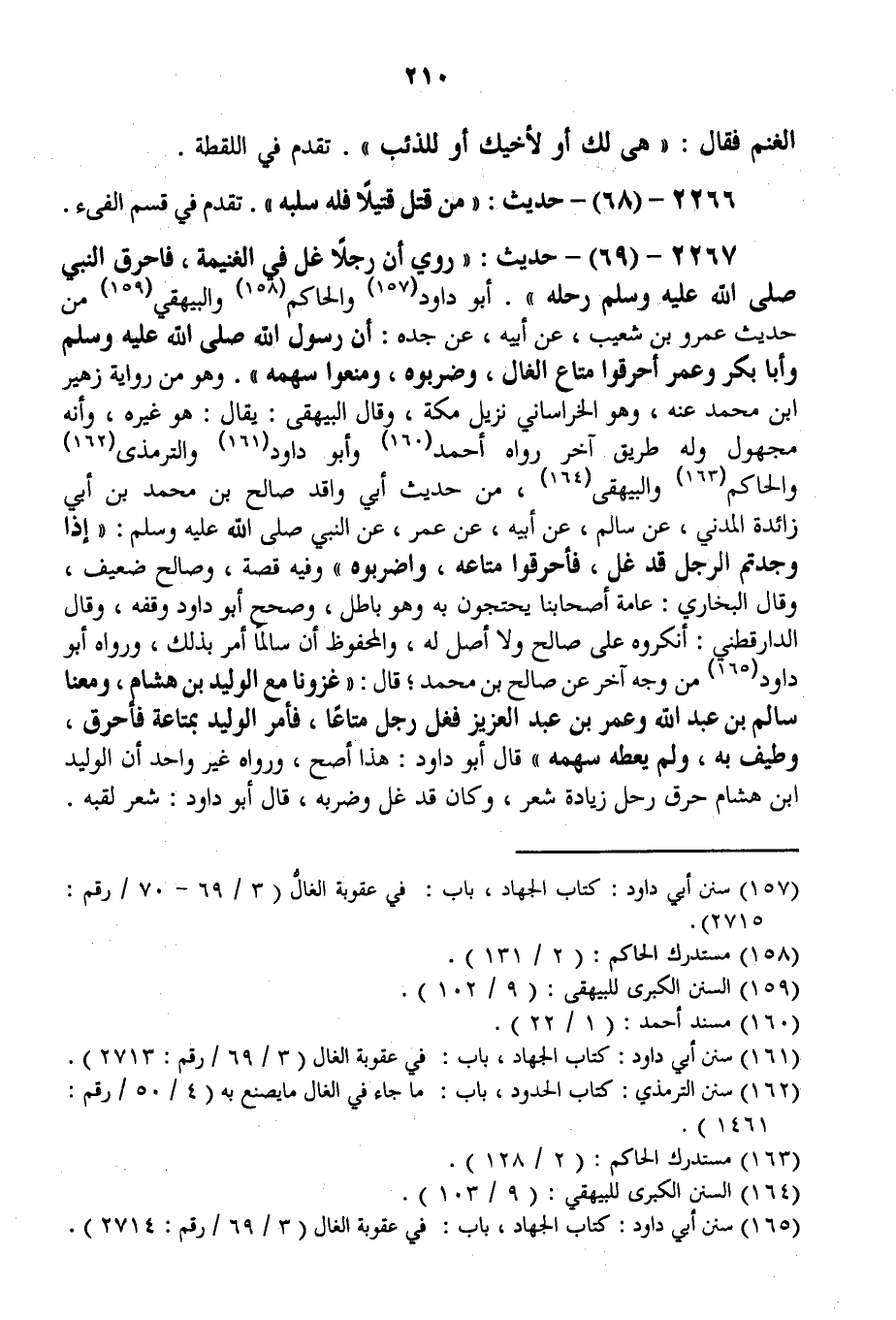 2267 - (69) - حَدِيثُ: «رُوِيَ أَنَّ رَجُلًا غَلَّ فِي الْغَنِيمَةِ، فَأَحْرَقَ النَّبِيُّ - صَلَّى اللَّهُ عَلَيْهِ وَسَلَّمَ - رَحْلَهُ» . أَبُو دَاوُد وَالْحَاكِمُ وَالْبَيْهَقِيُّ مِنْ حَدِيثِ عَمْرِو بْنِ شُعَيْبٍ، عَنْ أَبِيهِ، عَنْ جَدِّهِ: «أَنَّ رَسُولَ اللَّهِ - صَلَّى اللَّهُ عَلَيْهِ وَسَلَّمَ - وَأَبَا بَكْرٍ وَعُمَرَ أَحْرَقُوا مَتَاعَ الْغَالِّ، وَضَرَبُوهُ، وَمَنَعُوا سَهْمَهُ» . وَهُوَ مِنْ رِوَايَةِ زُهَيْرِ بْنِ مُحَمَّدٍ عَنْهُ، وَهُوَ الْخُرَاسَانِيُّ نَزِيلُ مَكَّةَ، وَقَالَ الْبَيْهَقِيُّ: يُقَالُ: هُوَ غَيْرُهُ، وَأَنَّهُ مَجْهُولٌ وَلَهُ طَرِيقٌ آخَرُ رَوَاهُ أَحْمَدُ وَأَبُو دَاوُد وَالتِّرْمِذِيُّ وَالْحَاكِمُ وَالْبَيْهَقِيُّ، مِنْ حَدِيثِ أَبِي وَاقِدٍ صَالِحِ بْنِ مُحَمَّدِ بْنِ أَبِي زَائِدَةَ الْمَدَنِيِّ، عَنْ سَالِمٍ، عَنْ أَبِيهِ، عَنْ عُمَرَ، «عَنْ النَّبِيِّ - صَلَّى اللَّهُ عَلَيْهِ وَسَلَّمَ -: إذَا وَجَدْتُمْ الرَّجُلَ قَدْ غَلَّ، فَأَحْرِقُوا مَتَاعَهُ، وَاضْرِبُوهُ» وَفِيهِ قِصَّةٌ، وَصَالِحٌ ضَعِيفٌ، وَقَالَ الْبُخَارِيُّ: عَامَّةُ أَصْحَابِنَا يَحْتَجُّونَ بِهِ وَهُوَ بَاطِلٌ، وَصَحَّحَ أَبُو دَاوُد وَقْفَهُ، وَقَالَ الدَّارَقُطْنِيُّ: أَنْكَرُوهُ عَلَى صَالِحٍ وَلَا أَصْلَ لَهُ، وَالْمَحْفُوظُ أَنَّ سَالَمَا أَمَرَ بِذَلِكَ.