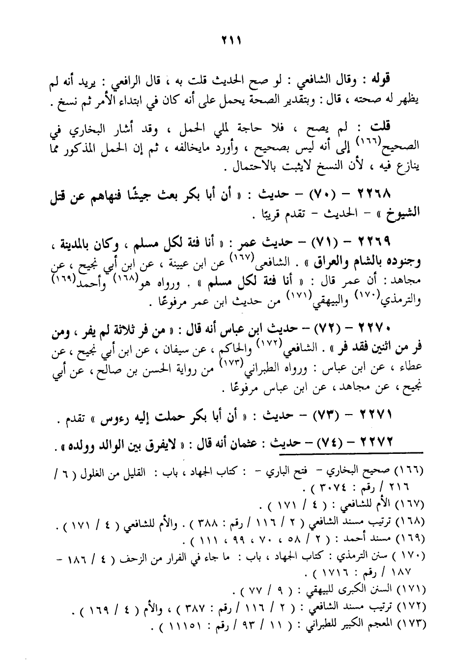 وَرَوَاهُ هُوَ وَأَحْمَدُ وَالتِّرْمِذِيُّ وَالْبَيْهَقِيُّ مِنْ حَدِيثِ ابْنِ عُمَرَ مَرْفُوعًا. 2270 - (72) - حَدِيثُ ابْنِ عَبَّاسٍ أَنَّهُ قَالَ: «مَنْ فَرَّ مِنْ ثَلَاثَةٍ لَمْ يَفِرَّ، وَمَنْ فَرَّ مِنْ اثْنَيْنِ فَقَدْ فَرَّ» . الشَّافِعِيُّ وَالْحَاكِمُ، عَنْ سُفْيَانَ، عَنْ ابْنِ أَبِي نَجِيحٍ، عَنْ عَطَاءٍ، عَنْ ابْنِ عَبَّاسٍ: وَرَوَاهُ الطَّبَرَانِيُّ مِنْ رِوَايَةِ الْحَسَنِ بْنِ صَالِحٍ، عَنْ أَبِي نَجِيحٍ، عَنْ مُجَاهِدٍ، عَنْ ابْنِ عَبَّاسٍ مَرْفُوعًا.