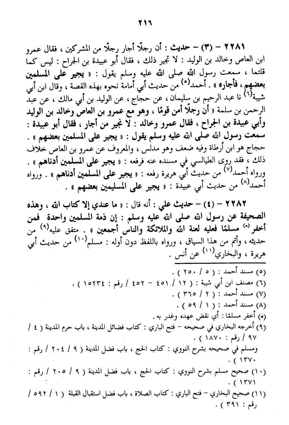 حَدِيثُ: «أَنَّ رَجُلًا أَجَارَ رَجُلًا مِنْ الْمُشْرِكِينَ، فَقَالَ عَمْرُو بْنُ الْعَاصِ وَخَالِدُ بْنُ الْوَلِيدِ: لَا تُجِيرُ ذَلِكَ، فَقَالَ أَبُو عُبَيْدَةَ بْنُ الْجَرَّاحِ: لَيْسَ كَمَا قُلْتُمَا، سَمِعْتُ رَسُولَ اللَّهِ - صَلَّى اللَّهُ عَلَيْهِ وَسَلَّمَ - يَقُولُ: يُجِيرُ عَلَى الْمُسْلِمِينَ بَعْضُهُمْ» فَأَجَارَهُ. أَحْمَدُ مِنْ حَدِيثِ أَبِي أُمَامَةَ نَحْوُهُ بِهَذِهِ الْقِصَّةِ، وَقَالَ ابْنُ أَبِي شَيْبَةَ نا عَبْدُ الرَّحِيمِ بْنُ سُلَيْمَانَ، عَنْ حَجَّاجٍ، عَنْ الْوَلِيدِ بْنِ أَبِي مَالِكٍ، عَنْ عَبْدِ الرَّحْمَنِ بْنِ سَلَمَةَ «أَنَّ رَجُلًا أَمَّنَ قَوْمًا، وَهُوَ مَعَ عَمْرِو بْنِ الْعَاصِ وَخَالِدِ بْنِ الْوَلِيدِ وَأَبِي عُبَيْدَةَ بْنِ الْجَرَّاحِ، فَقَالَ عَمْرٌو وَخَالِدٌ: لَا نُجِيرُ مَنْ أَجَارَ، فَقَالَ أَبُو عُبَيْدَةَ: سَمِعْت رَسُولَ اللَّهِ - صَلَّى اللَّهُ عَلَيْهِ وَسَلَّمَ - يَقُولُ: يُجِيرُ عَلَى الْمُسْلِمِينَ بَعْضُهُمْ» . حَجَّاجُ هُوَ ابْنُ أَرْطَاةَ وَفِيهِ ضَعْفٌ وَهُوَ مُدَلِّسٌ، وَالْمَعْرُوفُ عَنْ عَمْرِو بْنِ الْعَاصِ خِلَافُ ذَلِكَ، فَقَدْ رَوَى الطَّيَالِسِيُّ فِي مُسْنَدِهِ عَنْهُ فَرَفَعَهُ: «يُجِيرُ عَلَى الْمُسْلِمِينَ أَدْنَاهُمْ» . وَرَوَاهُ أَحْمَدُ مِنْ حَدِيثِ أَبِي هُرَيْرَةَ رَفَعَهُ: «يُجِيرُ عَلَى الْمُسْلِمِينَ أَدْنَاهُمْ» . وَرَوَاهُ أَحْمَدُ مِنْ حَدِيثِ أَبِي عُبَيْدَةَ: «يُجِيرُ عَلَى الْمُسْلِمِينَ بَعْضُهُمْ» . 2282 - (4) - حَدِيثُ «عَلِيٍّ: أَنَّهُ قَالَ: مَا عِنْدِي إلَّا كِتَابُ اللَّهِ، وَهَذِهِ الصَّحِيفَةُ عَنْ رَسُولِ اللَّهِ - صَلَّى اللَّهُ عَلَيْهِ وَسَلَّمَ -: إنَّ ذِمَّةَ الْمُسْلِمِينَ وَاحِدَةٌ فَمَنْ أَخْفَرَ مُسْلِمًا فَعَلَيْهِ لَعْنَةُ اللَّهِ وَالْمَلَائِكَةِ وَالنَّاسِ أَجْمَعِينَ» . مُتَّفَقٌ عَلَيْهِ مِنْ حَدِيثِهِ، وَأَتَمُّ مِنْ هَذَا السِّيَاقِ، وَرَوَاهُ بِاللَّفْظِ دُونَ أَوَّلِهِ: مُسْلِمٌ مِنْ حَدِيثِ أَبِي هُرَيْرَةَ، وَالْبُخَارِيُّ عَنْ أَنَسٍ.