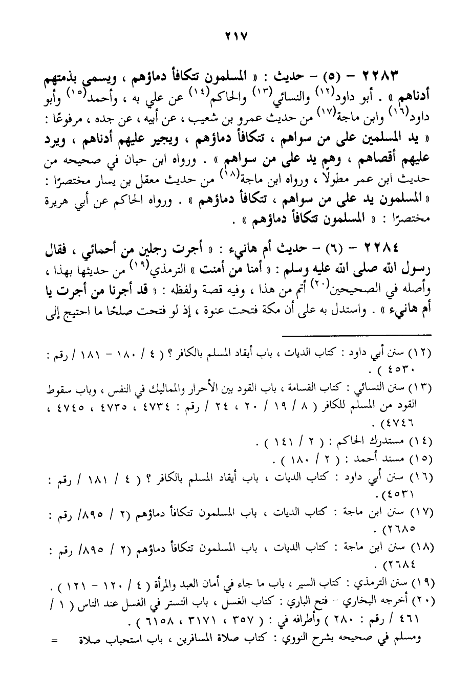 حَدِيثُ: «الْمُسْلِمُونَ تَتَكَافَأُ دِمَاؤُهُمْ، وَيَسْعَى بِذِمَّتِهِمْ أَدْنَاهُمْ» . أَبُو دَاوُد وَالنَّسَائِيُّ وَالْحَاكِمُ عَنْ عَلِيٍّ بِهِ، وَأَحْمَدُ وَأَبُو دَاوُد وَابْنُ مَاجَهْ مِنْ حَدِيثِ عَمْرِو بْنِ شُعَيْبٍ، عَنْ أَبِيهِ، عَنْ جَدِّهِ، مَرْفُوعًا: «يَدُ الْمُسْلِمِينَ عَلَى مَنْ سِوَاهُمْ، تَتَكَافَأُ دِمَاؤُهُمْ، وَيُجِيرُ عَلَيْهِمْ أَدْنَاهُمْ، وَيَرُدُّ عَلَيْهِمْ أَقْصَاهُمْ، وَهُمْ يَدٌ عَلَى مَنْ سِوَاهُمْ» وَرَوَاهُ ابْنُ حِبَّانَ فِي صَحِيحِهِ مِنْ حَدِيثِ ابْنِ عُمَرَ مُطَوَّلًا، وَرَوَاهُ ابْنُ مَاجَهْ مِنْ حَدِيثِ مَعْقِلِ بْنِ يَسَارٍ مُخْتَصَرًا: «الْمُسْلِمُونَ يَدٌ عَلَى مَنْ سِوَاهُمْ، تَتَكَافَأُ دِمَاؤُهُمْ» وَرَوَاهُ الْحَاكِمُ عَنْ أَبِي هُرَيْرَةَ مُخْتَصَرًا: «الْمُسْلِمُونَ تَتَكَافَأُ دِمَاؤُهُمْ» .