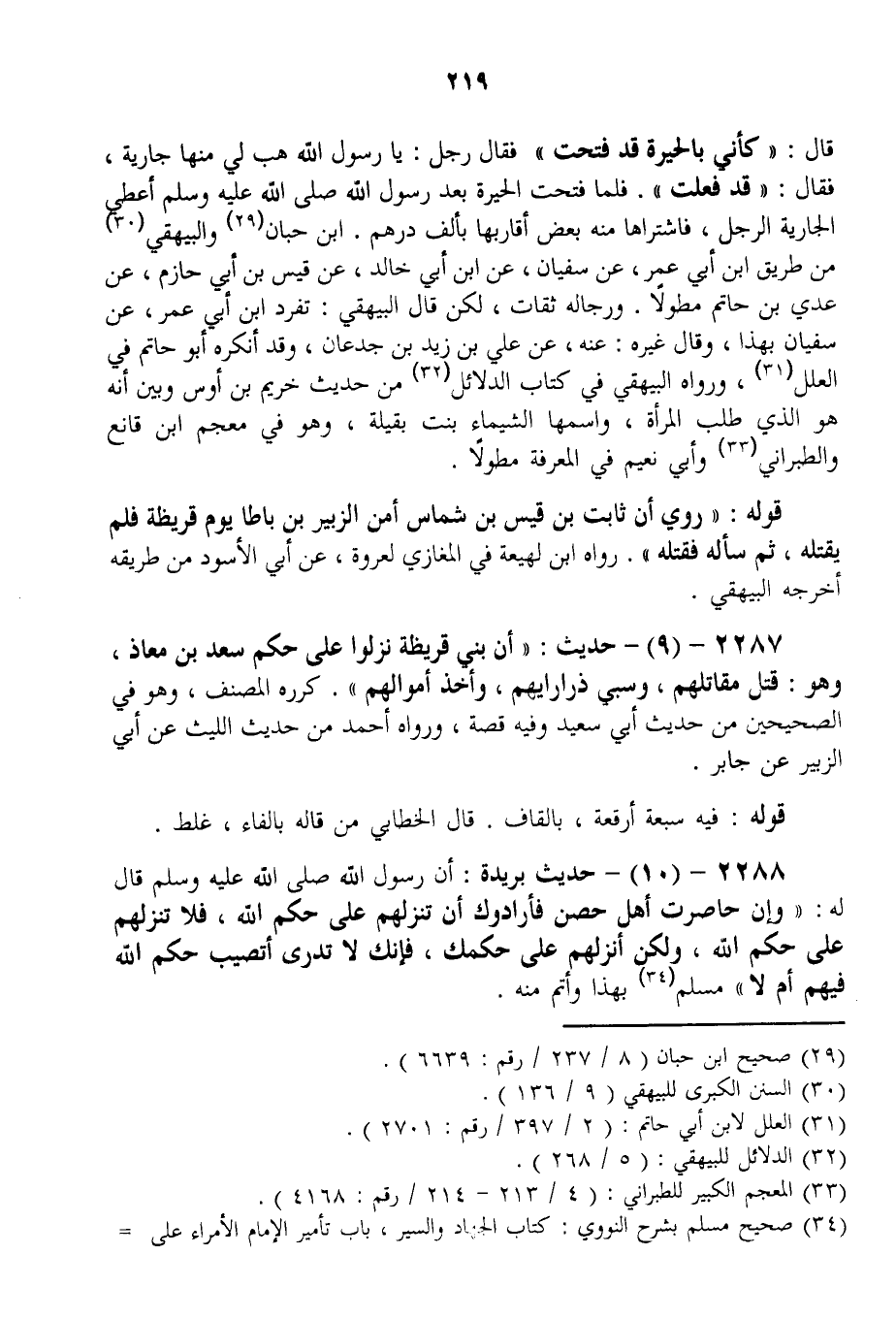 قَالَ: كَأَنَّ بِالْحِيرَةِ قَدْ فُتِحَتْ فَقَالَ رَجُلٌ: يَا رَسُولَ اللَّهِ هَبْ لِي مِنْهَا جَارِيَةً، فَقَالَ: قَدْ فَعَلْت. فَلَمَّا فُتِحَتْ الْحِيرَةُ بَعْدَ رَسُولِ اللَّهِ - صَلَّى اللَّهُ عَلَيْهِ وَسَلَّمَ - أُعْطِيَ الْجَارِيَةَ الرَّجُلُ، فَاشْتَرَاهَا مِنْهُ بَعْضُ أَقَارِبِهَا بِأَلْفِ دِرْهَمٍ» . ابْنُ حِبَّانَ وَالْبَيْهَقِيُّ مِنْ طَرِيقِ ابْنِ أَبِي عُمَرَ، عَنْ سُفْيَانَ، عَنْ ابْنِ أَبِي خَالِدٍ، عَنْ قَيْسِ بْنِ أَبِي حَازِمٍ، عَنْ عَدِيِّ بْنِ حَاتِمٍ مُطَوَّلًا. وَرِجَالُهُ ثِقَاتٌ، لَكِنْ قَالَ الْبَيْهَقِيُّ: تَفَرَّدَ ابْنُ أَبِي عُمَرَ، عَنْ سُفْيَانَ بِهَذَا، وَقَالَ غَيْرُهُ: عَنْهُ، عَنْ عَلِيِّ بْنِ زَيْدِ بْنِ جُدْعَانَ، وَقَدْ أَنْكَرَهُ أَبُو حَاتِمٍ فِي الْعِلَلِ، وَرَوَاهُ الْبَيْهَقِيُّ فِي كِتَابِ الدَّلَائِلِ مِنْ حَدِيثِ خُرَيْمِ بْنِ أَوْسٍ وَبَيَّنَ أَنَّهُ هُوَ الَّذِي طَلَبَ الْمَرْأَةَ، وَاسْمُهَا الشَّيْمَاءُ بِنْتُ بُقَيْلَةَ، وَهُوَ فِي مُعْجَمِ ابْنِ قَانِعٍ وَالطَّبَرَانِيِّ وَأَبِي نُعَيْمٍ فِي الْمَعْرِفَةِ مُطَوَّلًا.
